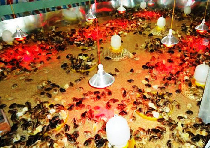 | Đàn gà giống mới ấp nở của ông Khanh được chiếu điện sưởi ấm. Ảnh: Minh Hoàng. |