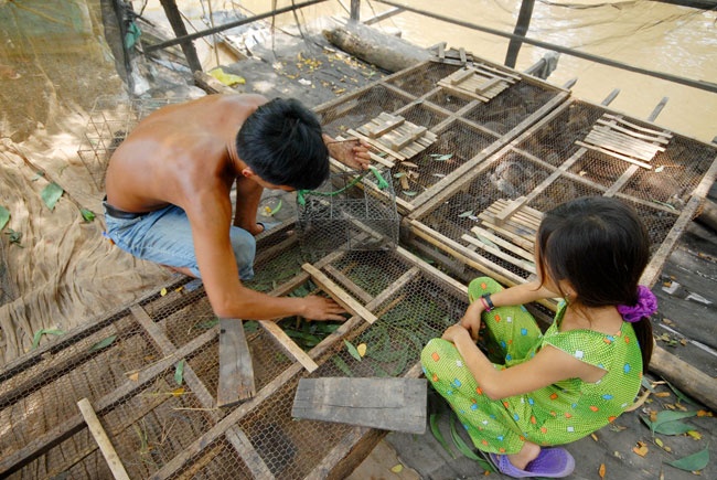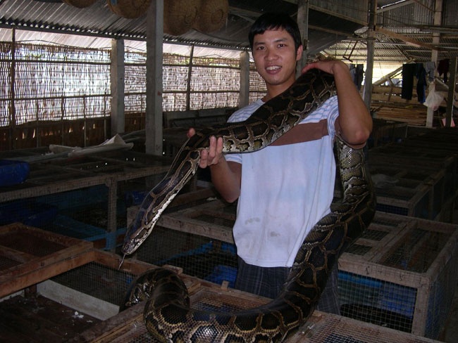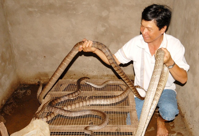 | Tận dụng vườn nhà, vợ chồng anh Chau Sóc Kim ở huyện Tri Tôn – An Giang nuôi 200 con rắn long thừa theo dạng bán hoang dã. Bình quân mỗi năm, đàn rắn trong vườn nhà anh cho thu hoạch một lần, trừ chi phí lãi gần 40 triệu đồng. |