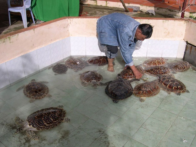 | Tại cửa biển Tây ở Hà Tiên –Kiên Giang, bà N.T.T nuôi khoảng 10 con vít biển trong hồ. Đây là những loại đang được bảo tồn và nằm trong sách đó. Gia đình bà N.T.T chủ yếu thu mua những con vít biển của ngư dân đánh bắt ở vùng biển Campuchia. |