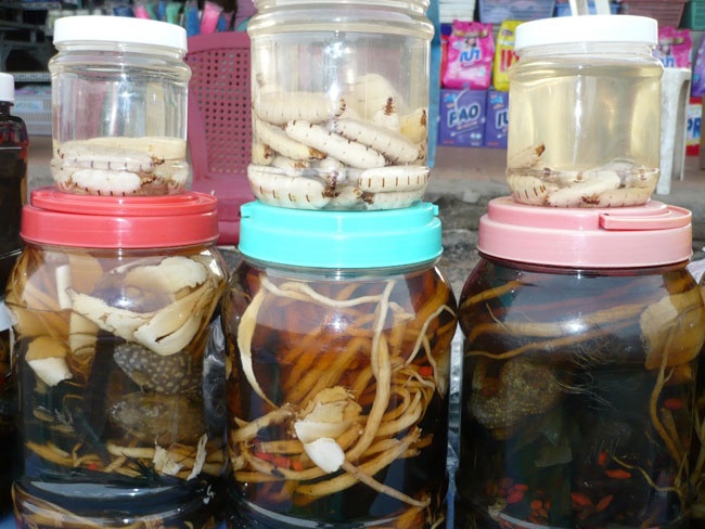 | Không chỉ là "mồi" ngòn, tắc kè còn dùng ngâm rượu. Rượu ngâm với tắc kè và mối chúa được bán rất chạy với giá từ 200.000 -500.000 đồng/1 lít. Những sản vật ngâm rượu này được bày bán nhiều nhất tại chợ cửa khẩu Tịnh Biên – An Giang. |