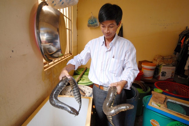 | Trong khi đó, anh Phan Thanh Tuyền, Phó chủ tịch xã Thới Đông, huyện Cờ Đỏ (TP.Cần Thơ) lại trực tiếp áp dụng mô hình nuôi rắn ri voi trong lu, hũ ở sau nhà, Hiện đàn rắn giống của anh có 70% rắn cái và 30% rắn đực, cho sinh sản để cung cấp con giống ra thị trường. Trung bình, mỗi con rắn giống của anh Tuyền nặng từ 1,8-3kg. Tổng thu nhập từ bán rắn thịt và rắn con giống trong năm được gần 50 triệu đồng, trừ chi phí còn lãi hơn 35 triệu đồng. |