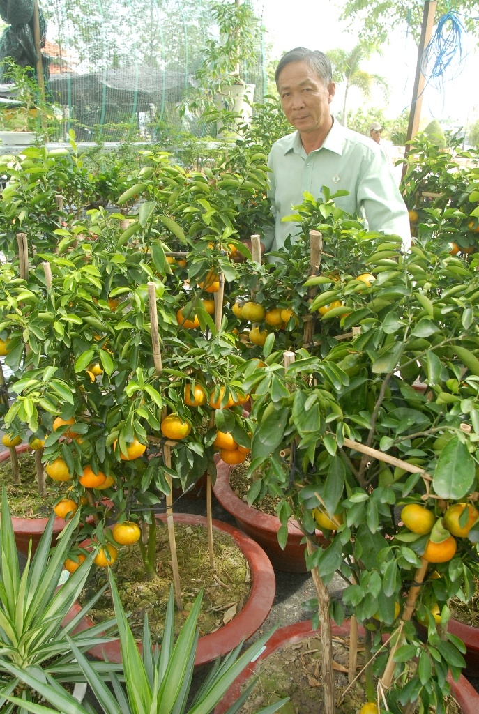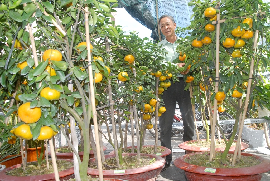 | Nông dân Lưu Văn Ràng ở ấp Hòa Khánh, xã Vĩnh Thới, huyện Lai Vung (Đồng Tháp) là nhà vườn đầu tiên của huyện thành công với mô hình trồng quýt hồng trên chậu, đem lại thu nhập hàng trăm triệu mỗi mùa Tết. |