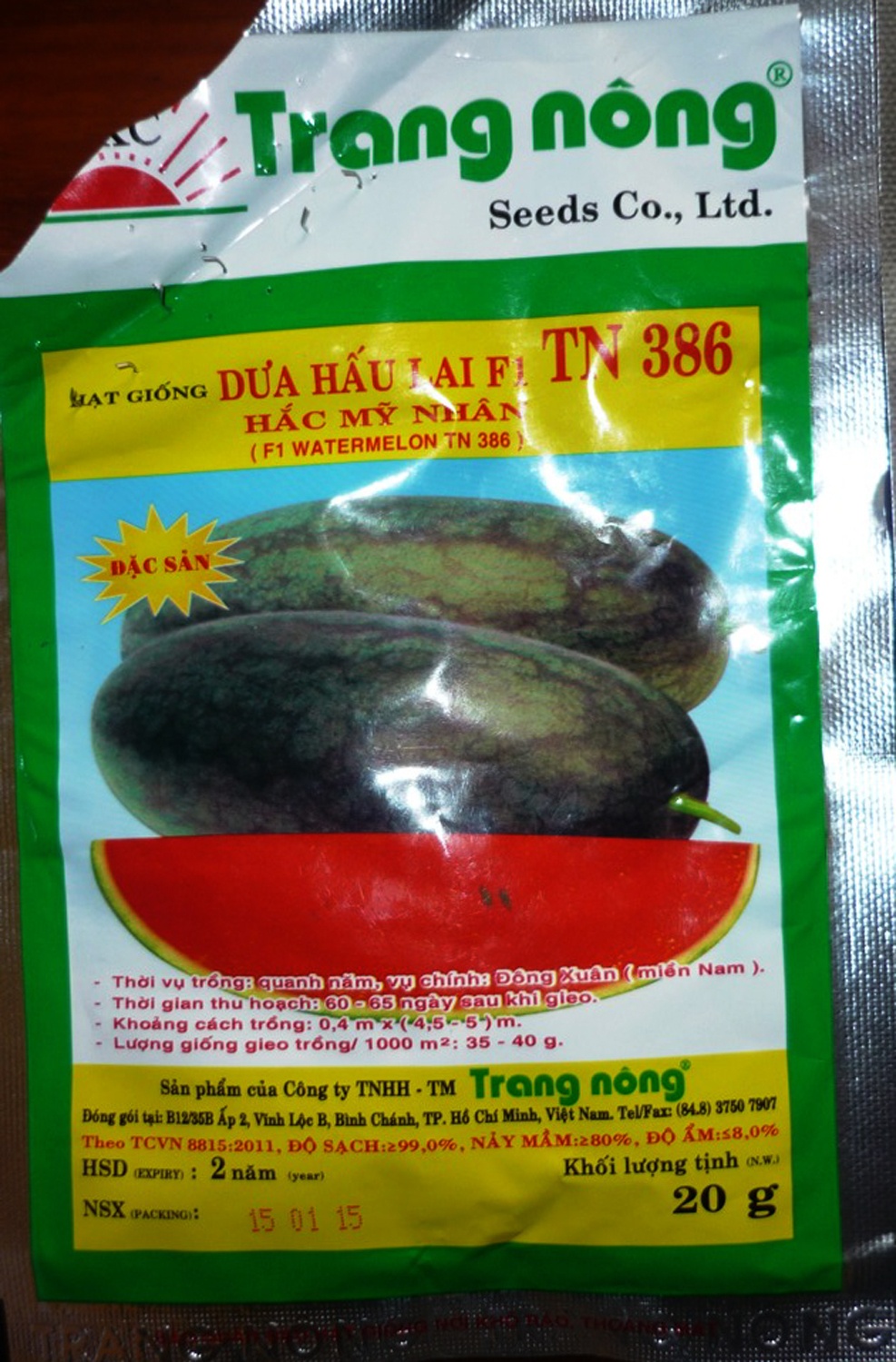 | Vỏ bao bì đựng hạt giống dưa hấu Hắc Mỹ Nhân kém chất lượng của Công ty TNHH Thương mại Trang Nông. Ảnh: Minh Hoàng. |