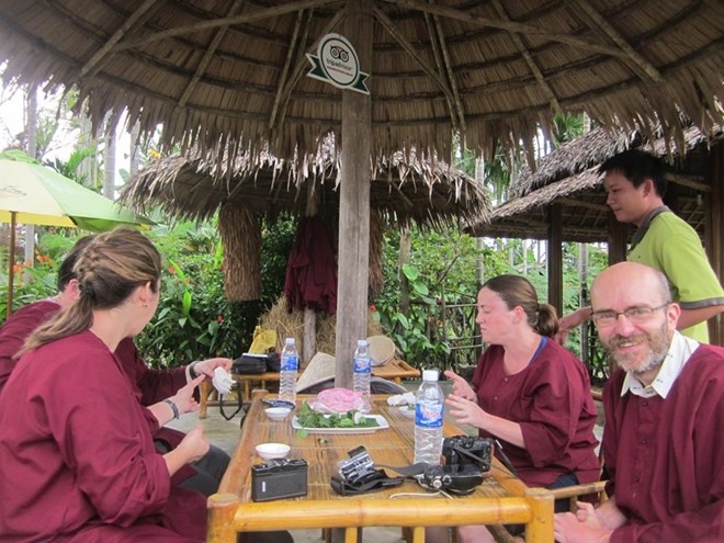 | Du khách được thưởng thức cơm nữa buổi, đúng với văn hoá thường nhật của người nông dân Việt Nam với món cơm nắm, gói lá chuối... |
