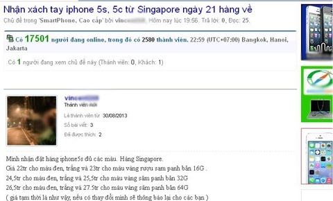 Một đoạn rao vặt khác được đặt trên một diễn đàn công nghệ thông báo, giá iPhone 5S hàng Singapore xách tay về Việt Nam là 16,4 triệu đồng cho phiên bản 16GB, các phiên bản 32 GB và 64GB lần lượt là 19 và 21,3 triệu đồng. Riêng iPhone 5C sẽ có giá 14,1 triệu cho bản 16GB và 16,3 triệu cho bản 32GB. Tất nhiên, giá trên chưa bao gồm tiền công xách tay. Ngoài ra, nếu khan hàng giá cũng có thể sẽ được đẩy lên cao hơn rất nhiều.| Trên một số trang rao vặt, những mẩu tin nhận xách tay iPhone 5S, 5C đã bắt đầu xuất hiện. |