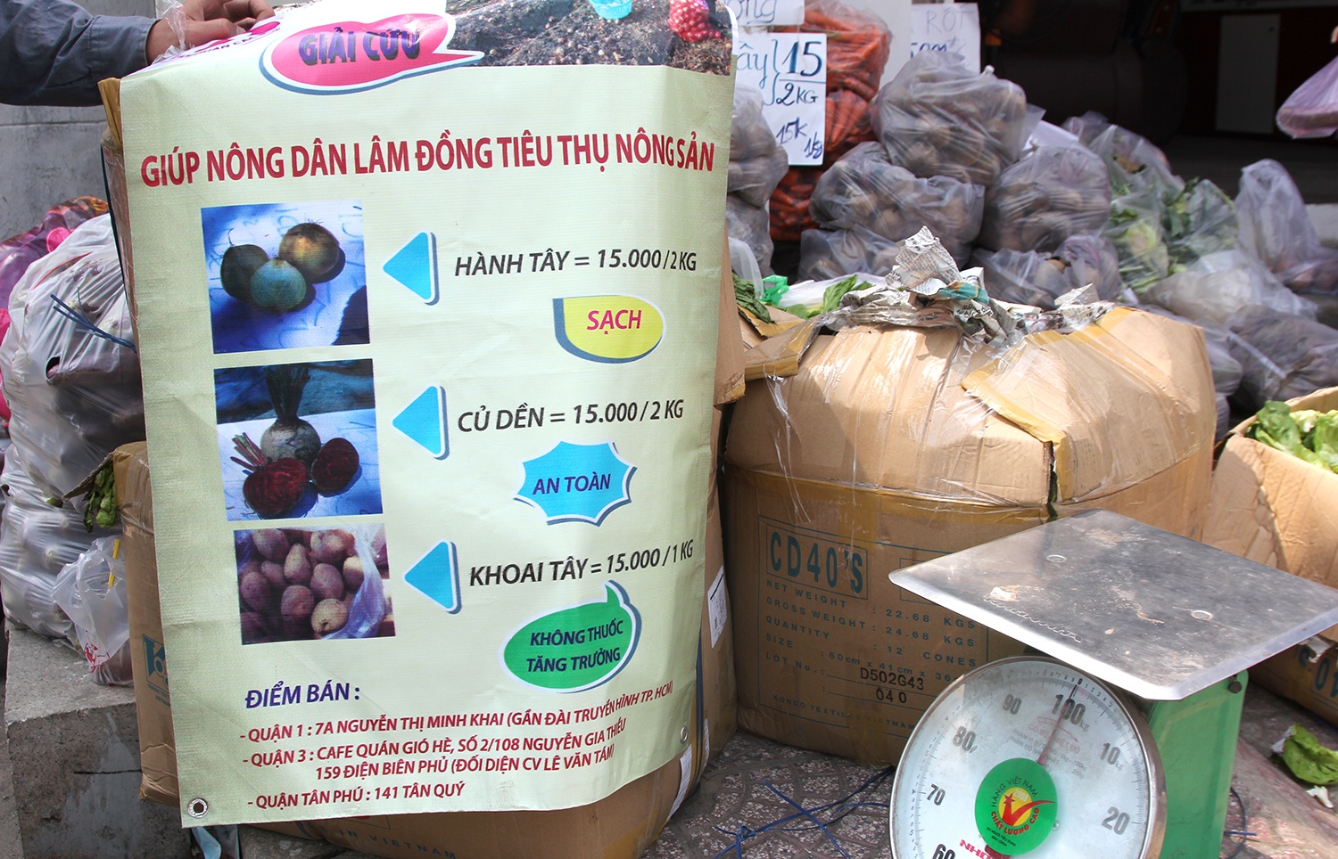 Trên đường Nguyễn Thị Minh Khai, quận 1, nhiều loại nông sản của Lâm Đồng như hành tây, củ dền, cà rốt, các loại rau xanh...được chất đống để bán cho người đi đường. Chị Nguyễn Thị Thanh Thúy, người chịu trách nhiệm điểm bán hàng này cho biết, riêng ngày chủ nhật, 19/4, chị đã nhập được 1,7 tấn nông sản Lâm Đồng.