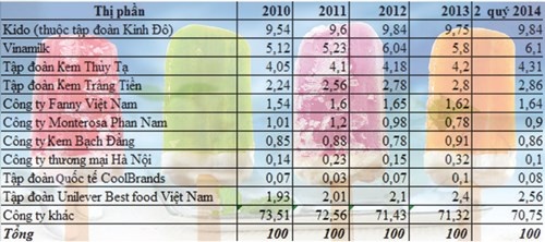 Trước sự mở rộng của các DN khối ngoại, liệu các hãng kem nội như Kido (Kinh Đô), Vinamilk, Thủy Tạ... có lép vế? Theo báo cáo phân tích của công ty TNHH Chứng khoán Ngân hàng TMCP Việt Nam Thịnh Vượng (VPBS), thị trường kem Việt Nam vẫn còn bị chi phối bởi các thương hiệu trong nước, dù sự hiện diện của các đối thủ nước ngoài đang gia tăng.