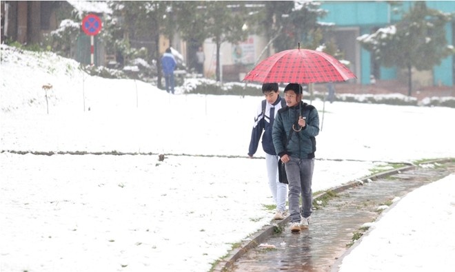 Đêm 16/12, thời tiết tại Sapa (Lào Cai) xuống -2 độ C, tuyết phủ trắng thị trấn. Tại nhiều ngôi trường, học sinh được nghỉ học nhưng do ở xa nên nhiều em không biết, vẫn đội mưa đội tuyết đến trường trong thời tiết giá lạnh.