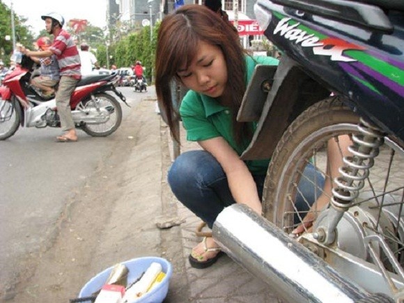 | Hình ảnh cô gái xinh đẹp vá xe giúp đỡ khách hành hương về chùa Bà (Bình Dương). |