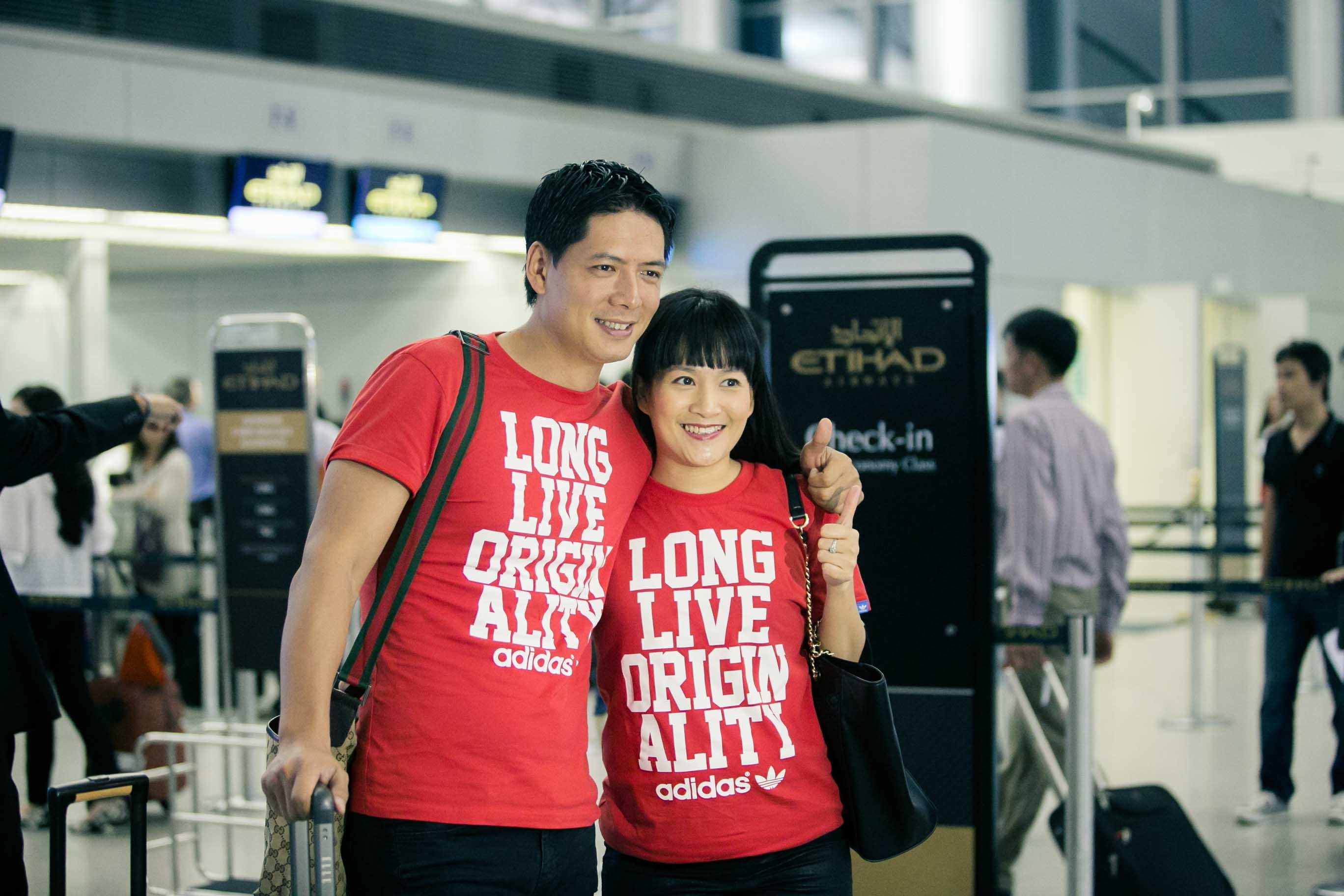 | Trong chuyến bay còn có sự xuất hiện của vợ chồng Bình Minh. Cả hai diện trang phục rất tình cảm. |