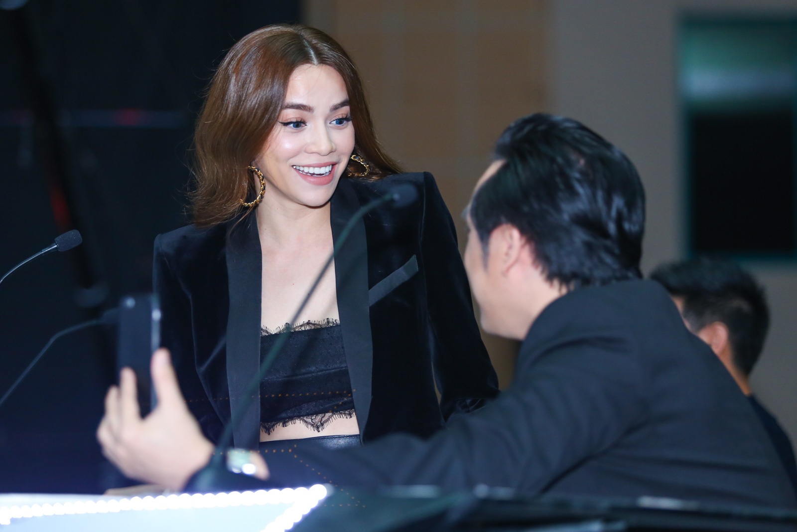Hồ Ngọc Hà vui vẻ trò chuyện cùng nhạc sĩ Dương Khắc Linh trước giờ lên sóng. Không hẹn mà gặp, cả 2 giám khảo đều "ton sur ton". |