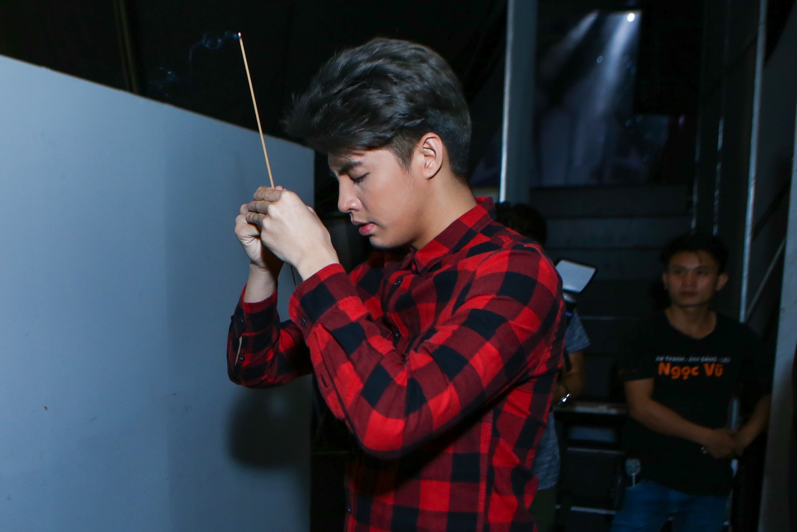 Noo Phước Thịnh cũng có mặt trong cánh gà ngay sau đó. Anh đi thẳng đến bàn thờ Tổ để thắp hương trước khi ra sân khấu. |