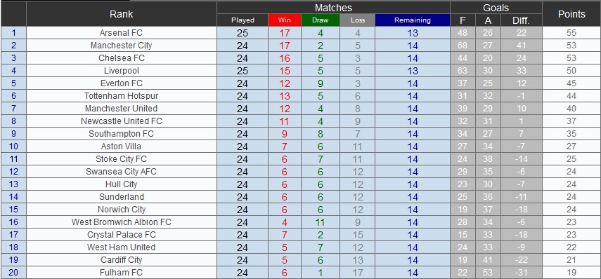- Trong trận đấu vừa khép lại cách đây ít phút, Liverpool đã gây sốc khi vùi dập Arsenal với tỷ số 5-1. Đây chính là cơ hội để cho Man City và Chelsea bứt lên giành ngôi vị số 1 sau vòng 25.