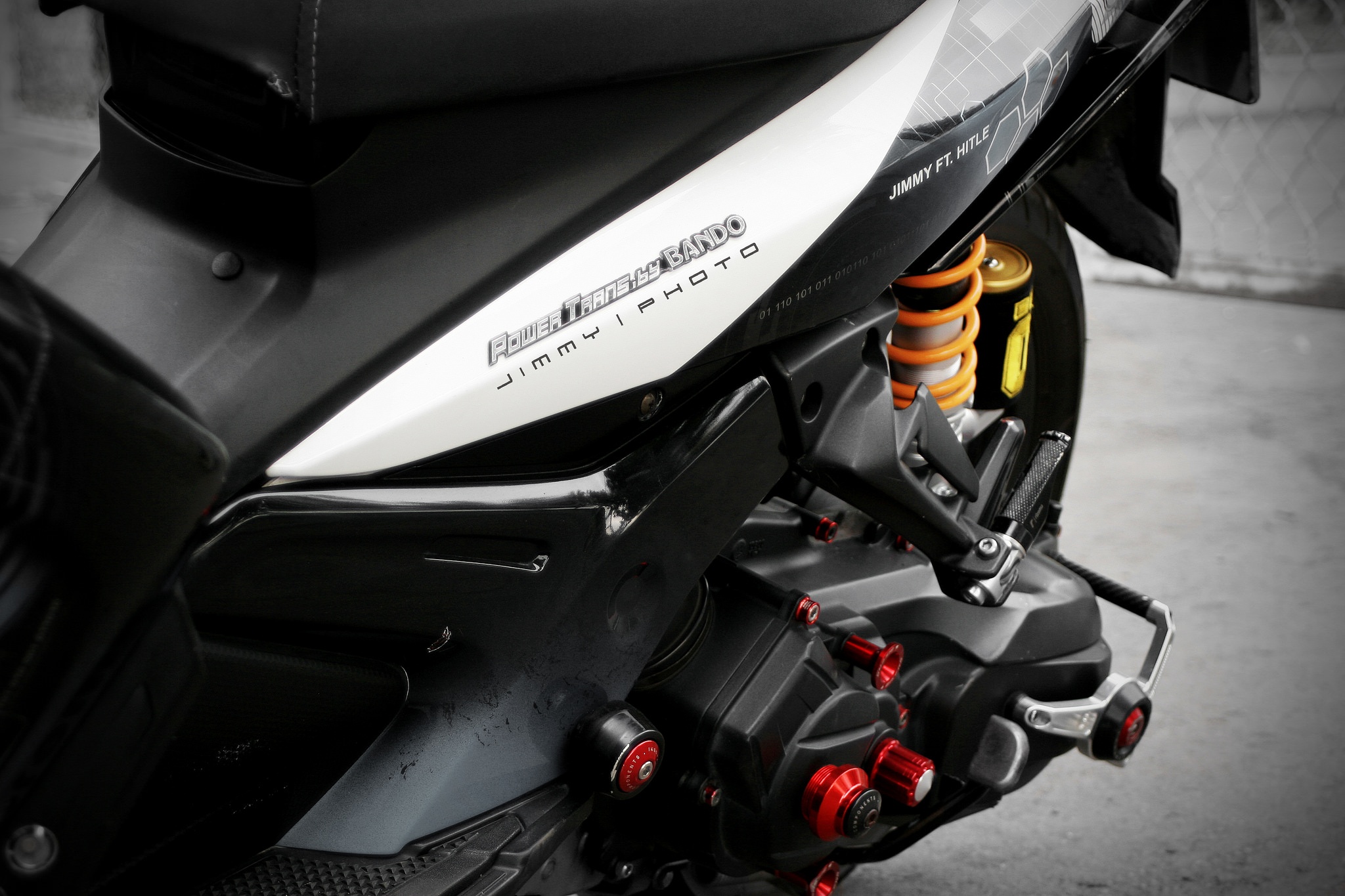 | Phuộc sau hiệu Ohlins, lốc máy gắn khá nhiều ốc và gù kiểng. Chiếc xe này đã được mở tua ECU nhằm tăng công suất động cơ. |