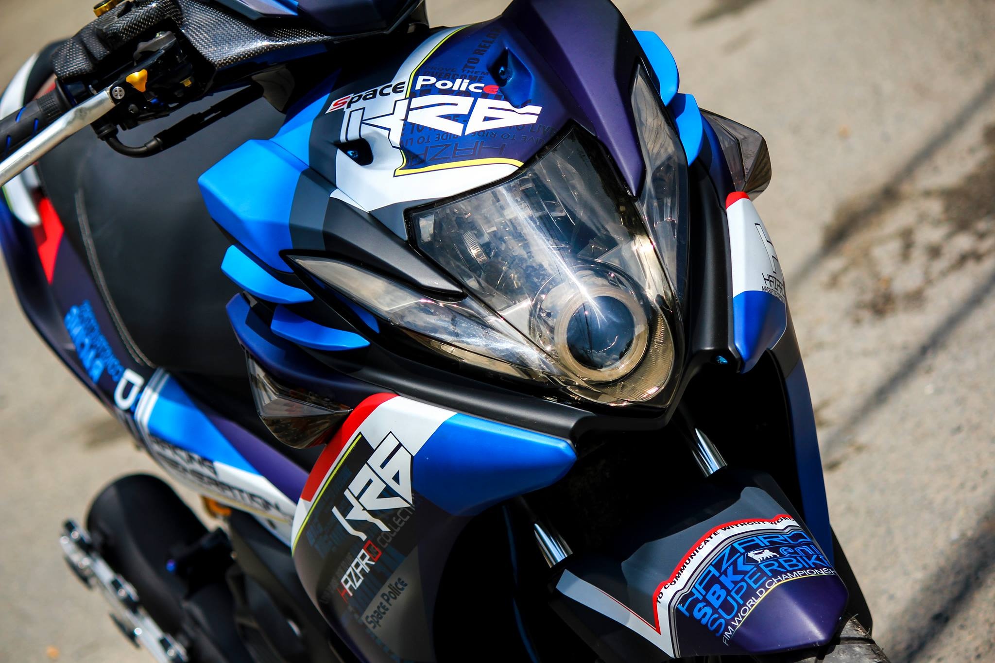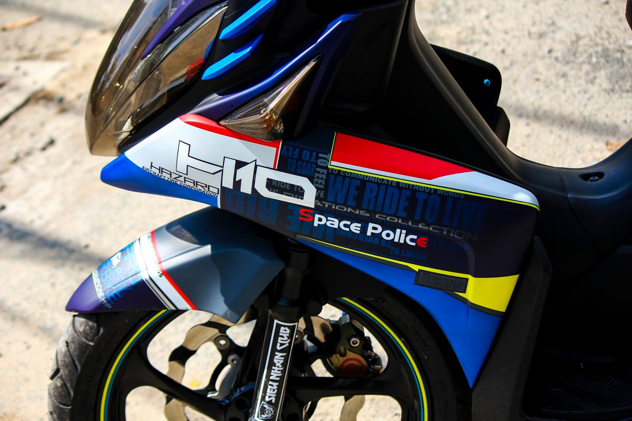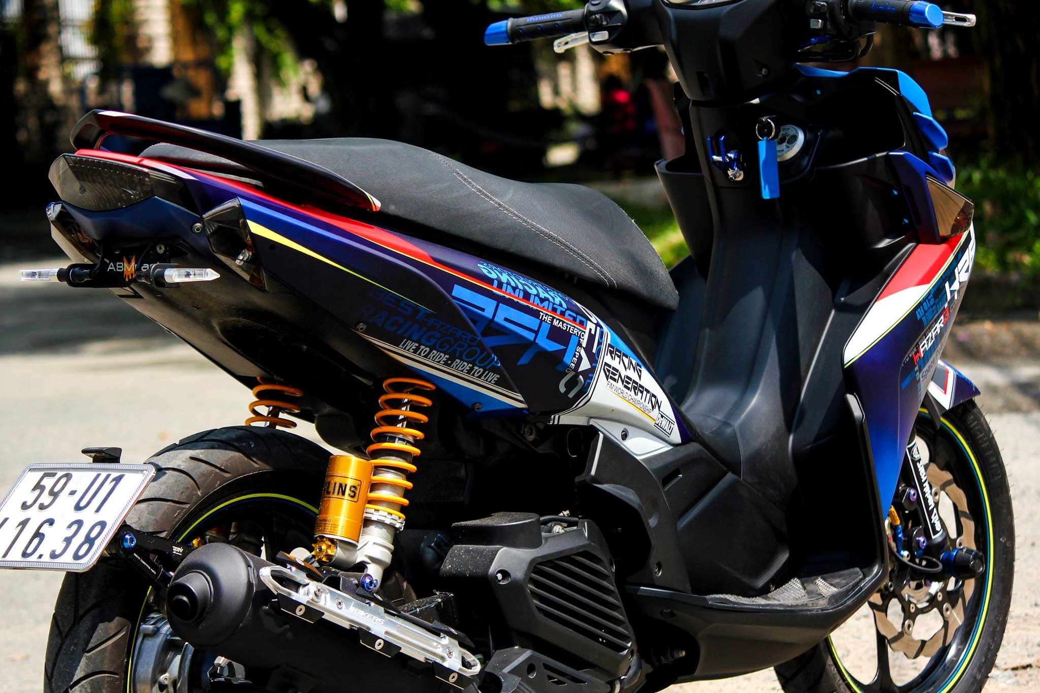 Trên nền màu xanh - bạc, chiếc xe tay ga sơn tem đồ họa với các logo hoặc câu nói nổi tiếng chủ nhân yêu thích.