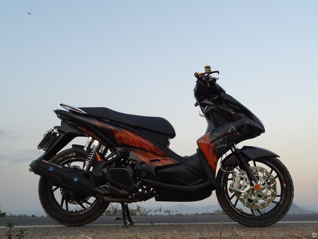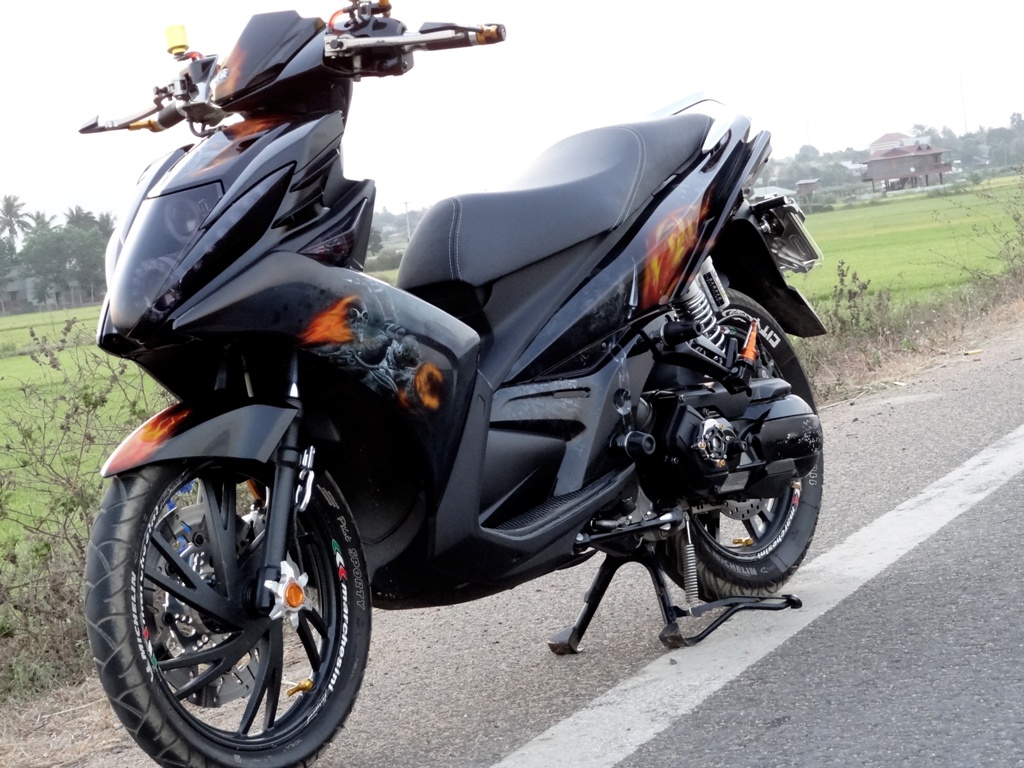 Chiếc xe tay ga của một biker ở Gia Lai có dàn áo vẽ airbrush theo phong cách phim Ma tốc độ, với các hiệu ứng lửa bốc cháy độc đáo.