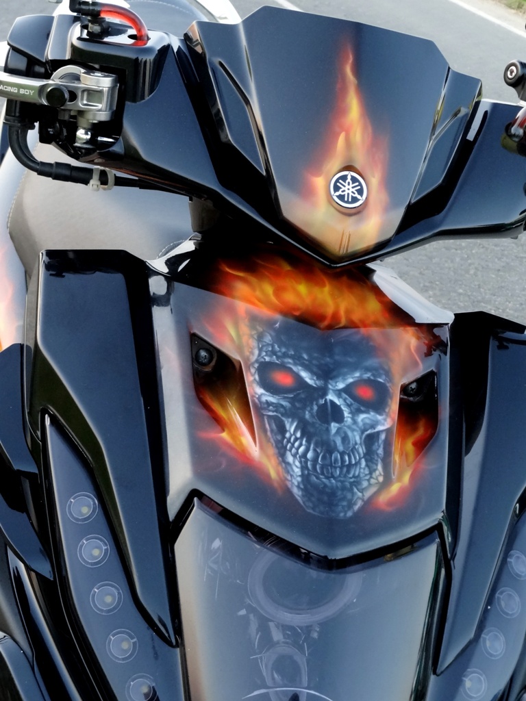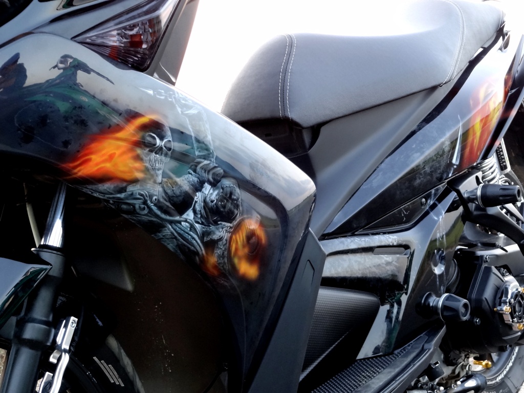 Điểm nhấn đặc biệt nhất trên xe là dàn áo vẽ airbrush theo phong cách phim Ghost Rider (Ma tốc độ). Hai cánh gà thể hiện nhân vật chính trong bộ phim đang trong tư thế cưỡi mô tô, tay cầm xích.