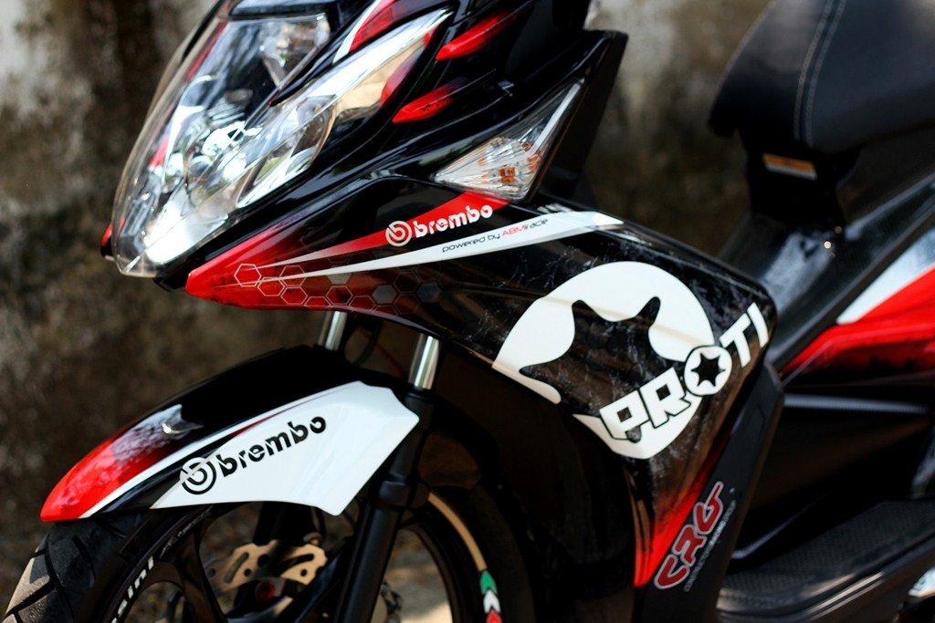 Nổi bật là dàn nhựa được sơn tem đấu airbrush hoàn toàn mới với background hiệu ứng độc đáo, kết hợp hài hòa cùng 3 tông màu đỏ - đen - trắng khiến con xe nhìn mạnh mẽ, thể thao, cá tính.