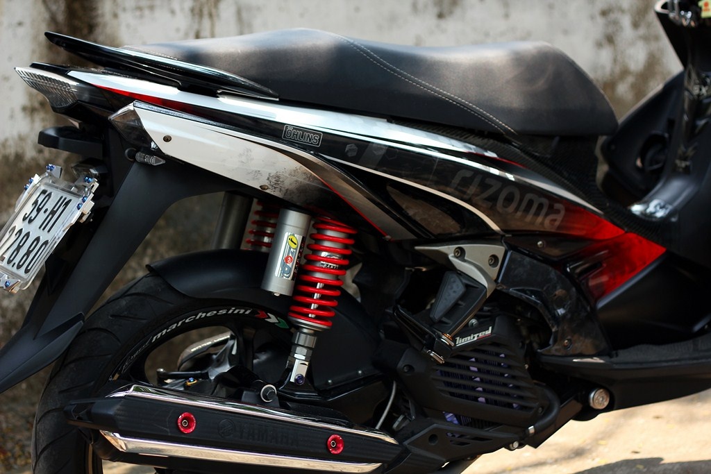 Mẫu xe tay ga với dàn nhựa sơn tem đấu kết hợp hài hòa 3 tông màu đỏ, đen, trắng cùng một loạt phụ kiện đồ chơi hàng hiệu Rizoma, Ohlins.