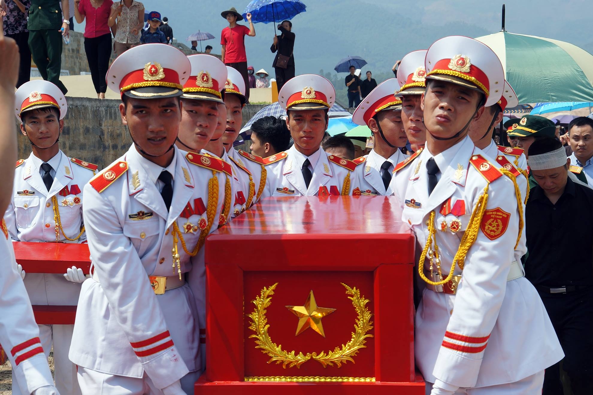 Nhạc sĩ An Hiếu, con trai của cố nhạc sĩ An Thuyên, bê bát hương cha vào nơi an táng.