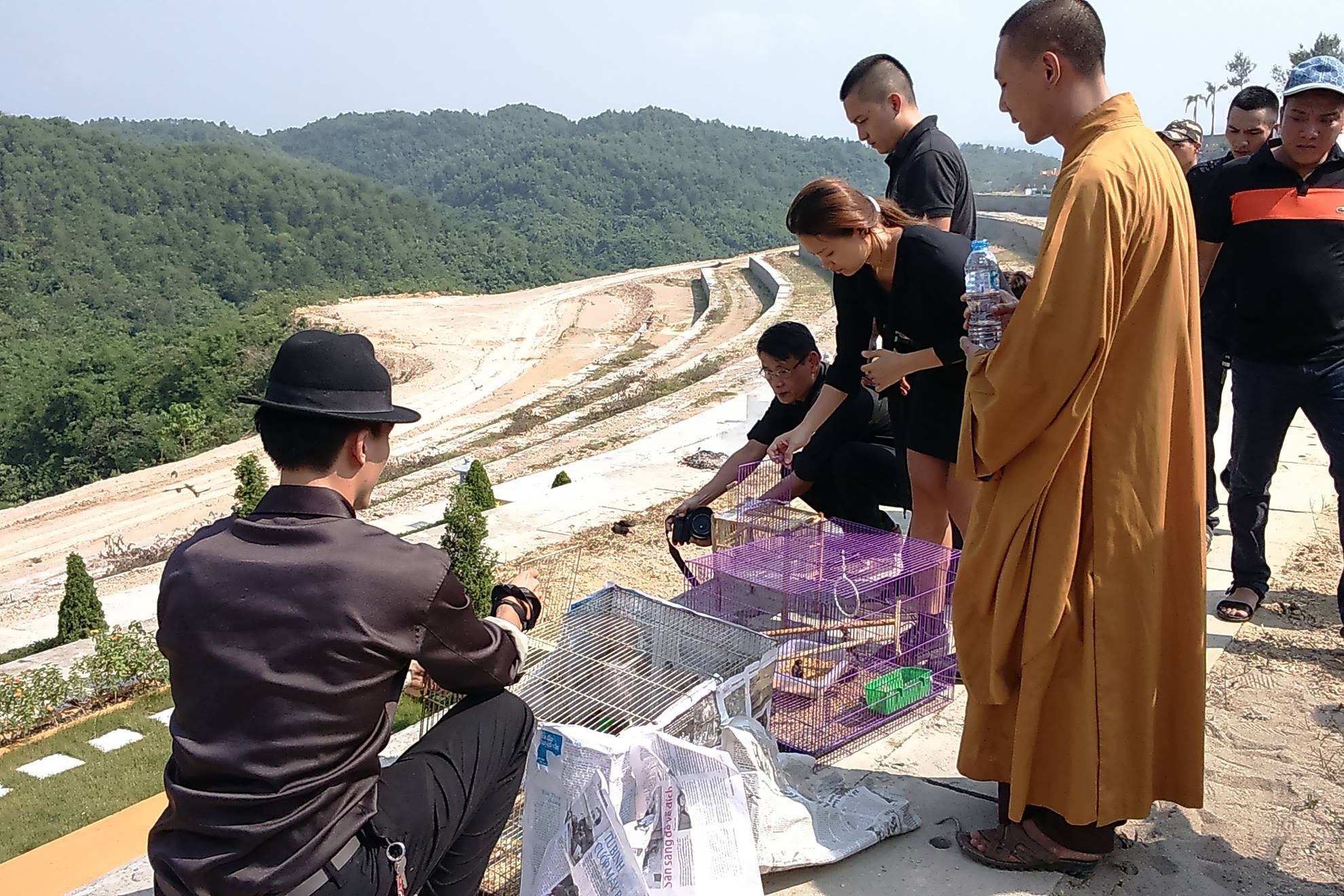 Sau lễ hạ huyệt, người nhà phóng sinh để mong nhạc sĩ An Thuyên siêu thoát về với đất Phật.