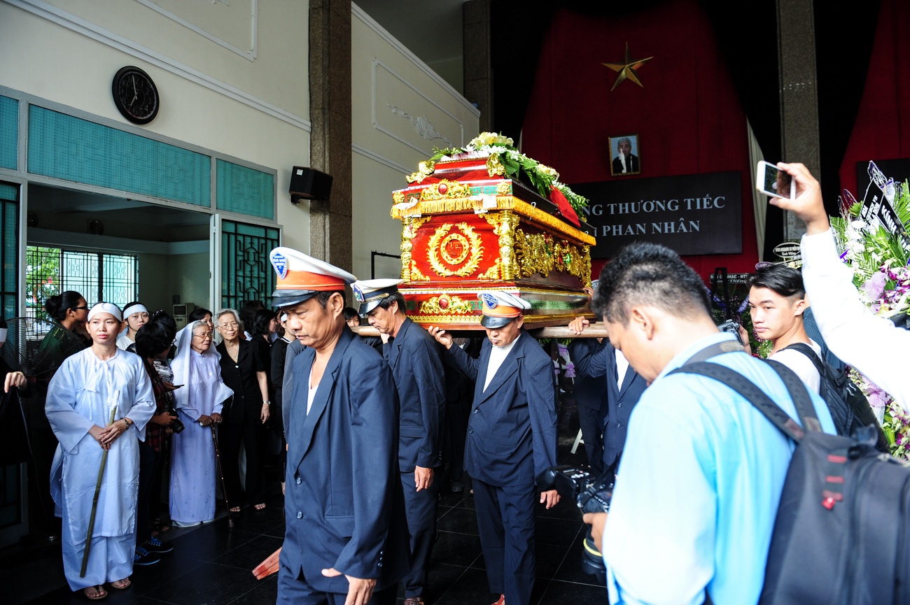 | Sáng sớm 2/7, người thân, đồng nghiệp có mặt tại Nhà tang lễ Thành phố làm lễ động quan nhạc sĩ Phan Nhân. Linh cữu ông được đưa đi hỏa táng tại Bình Hưng Hòa, TP HCM. Tro cốt được thờ tại chùa Hải Tuệ theo đúng di nguyện tác giả Hà Nội niềm tin và hy vọng. |