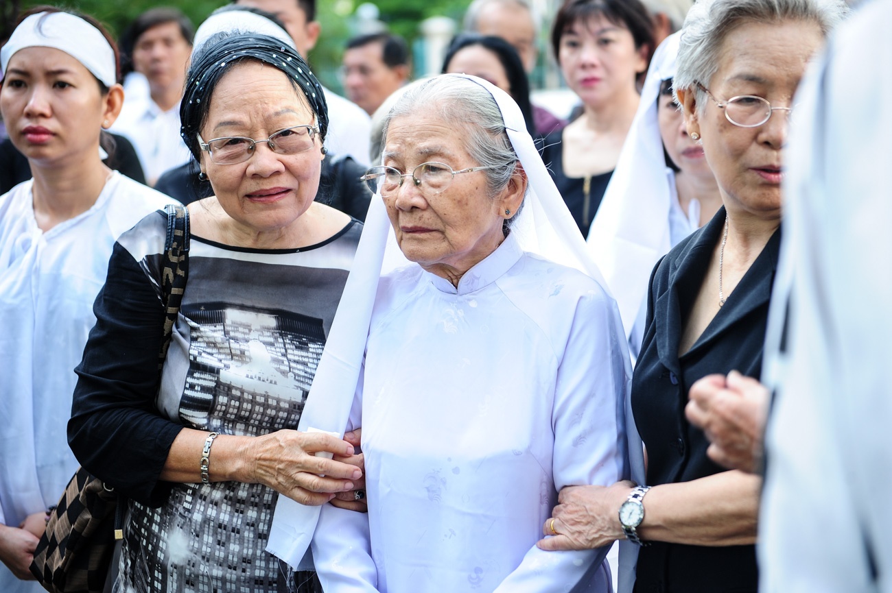NSƯT Phi Điểu không còn giữ được vẻ bình thản trong ngày cuối cùng tang lễ. Trong giây phút tiễn đưa người bạn đời về đất mẹ, gương mặt bà thất thần, đau đớn. Lúc này, người thân trong gia đình phải dìu nữ diễn viên lão làng ra xe tang. |