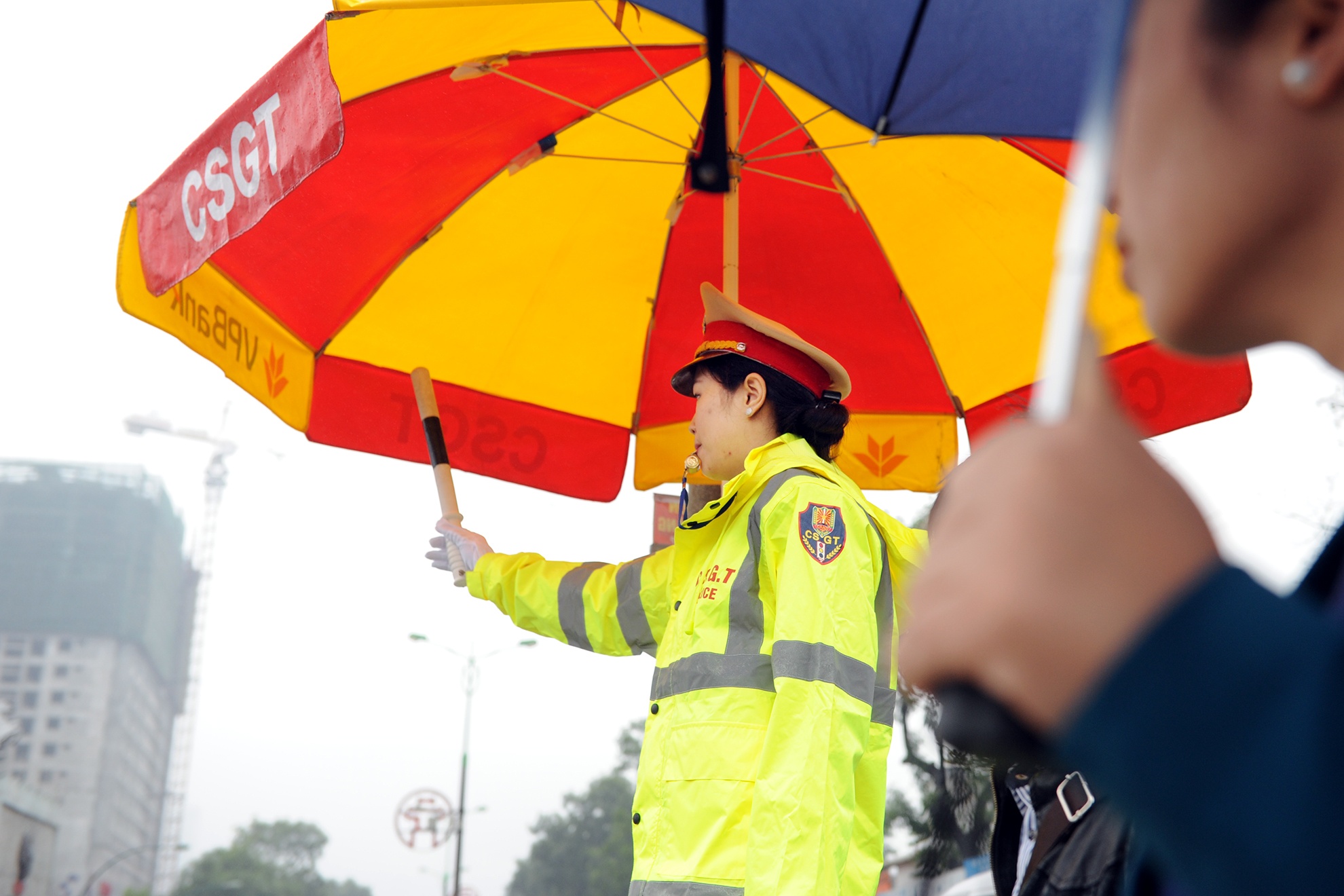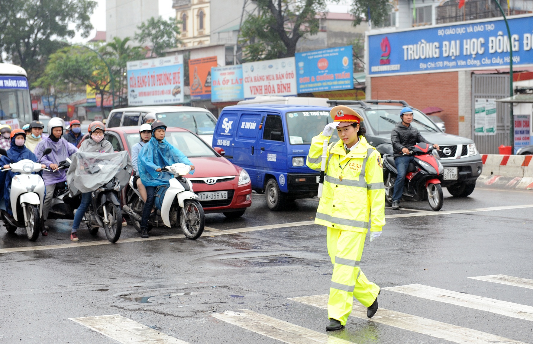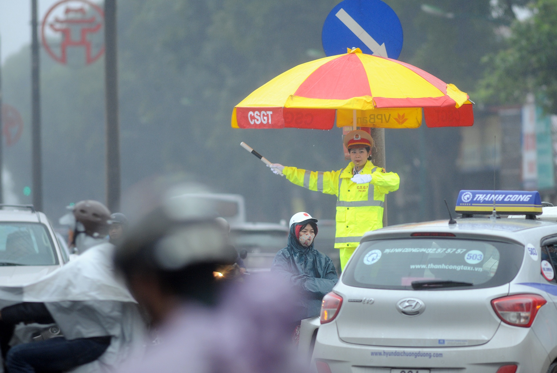 Cận ngày quốc tế phụ nữ 8/3, các nữ cảnh sát giao thông (công an Hà Nội) vẫn mặc áo mưa đứng phân luồng, hướng dẫn phương tiện chống ùn tắc giao thông.