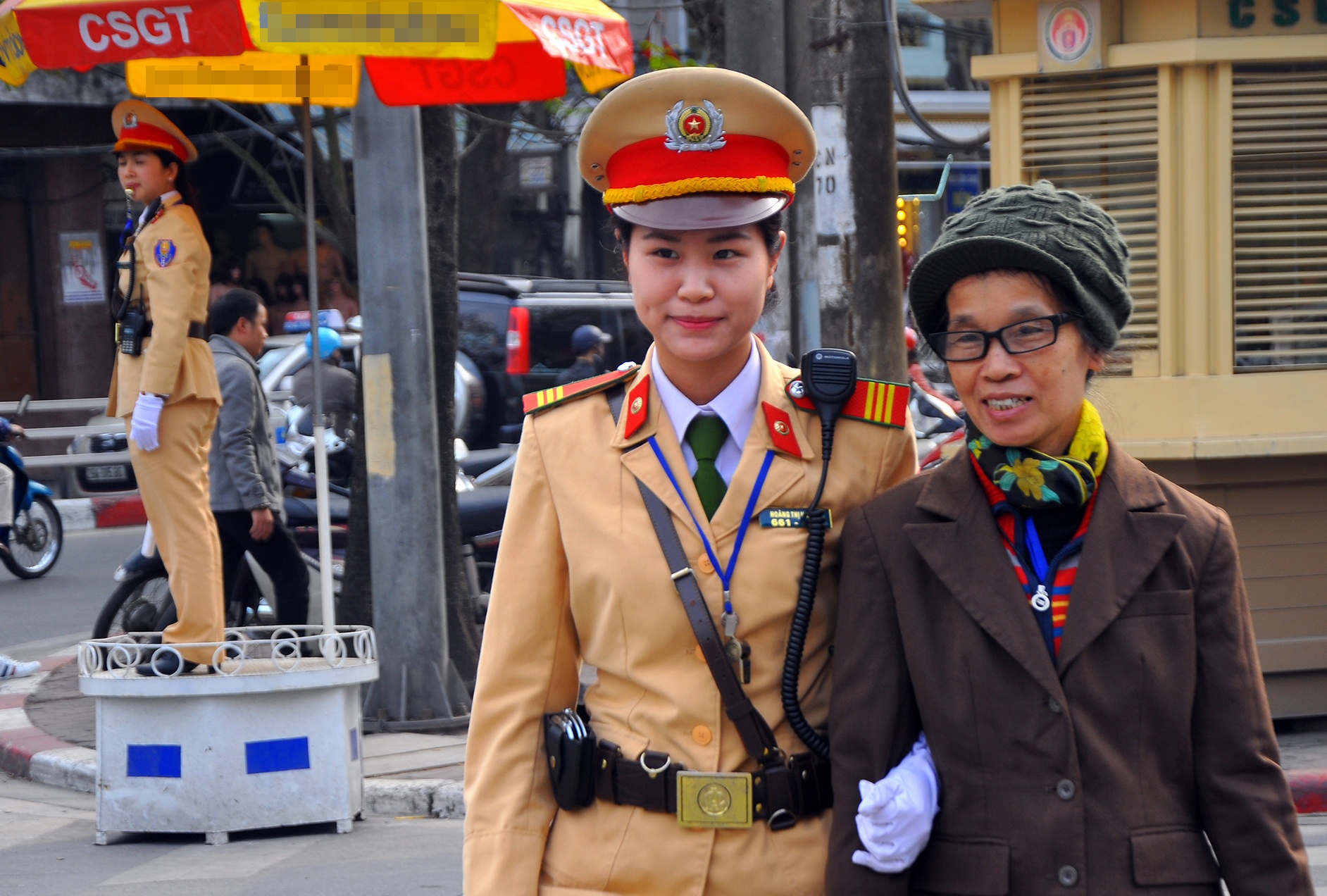 | Sau những buổi làm việc vất vả, Hương thường xuyên tham gia lớp tập huấn động tác điều khiển phương tiện giao thông, kiến thức chuyên ngành quản lý hành chính cũng như rèn luyện võ thuật của Phòng CSGT Hà Nội để sẵn sàng hoàn thành tốt mọi nhiệm vụ được giao. Ảnh: Trong ca trực của mình, thượng sĩ Hương vui vẻ đưa người phụ nữ sang đường.