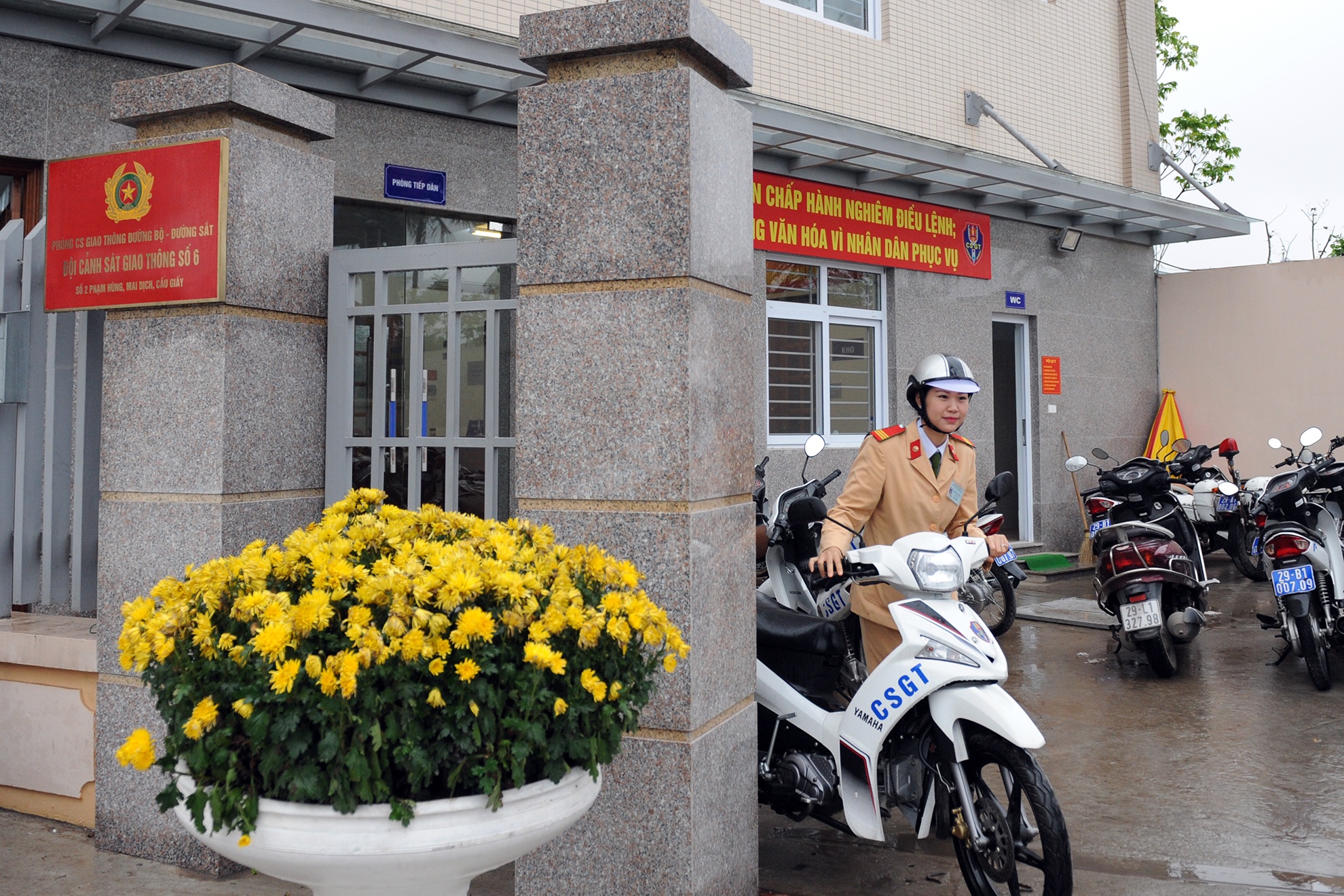 | Sau khi giao ban tại đơn vị, thượng sĩ Hoàng Thị Hương (25 tuổi), chiến sĩ đội cảnh sát giao thông số 6 (Phòng CSGT Hà Nội) ra bốt thực hiện nhiệm vụ hỗ trợ phân làn, điều tiết phương tiện giao thông giờ cao điểm tại nút giao Hoàng Quốc Việt - Phạm Văn Đồng. |