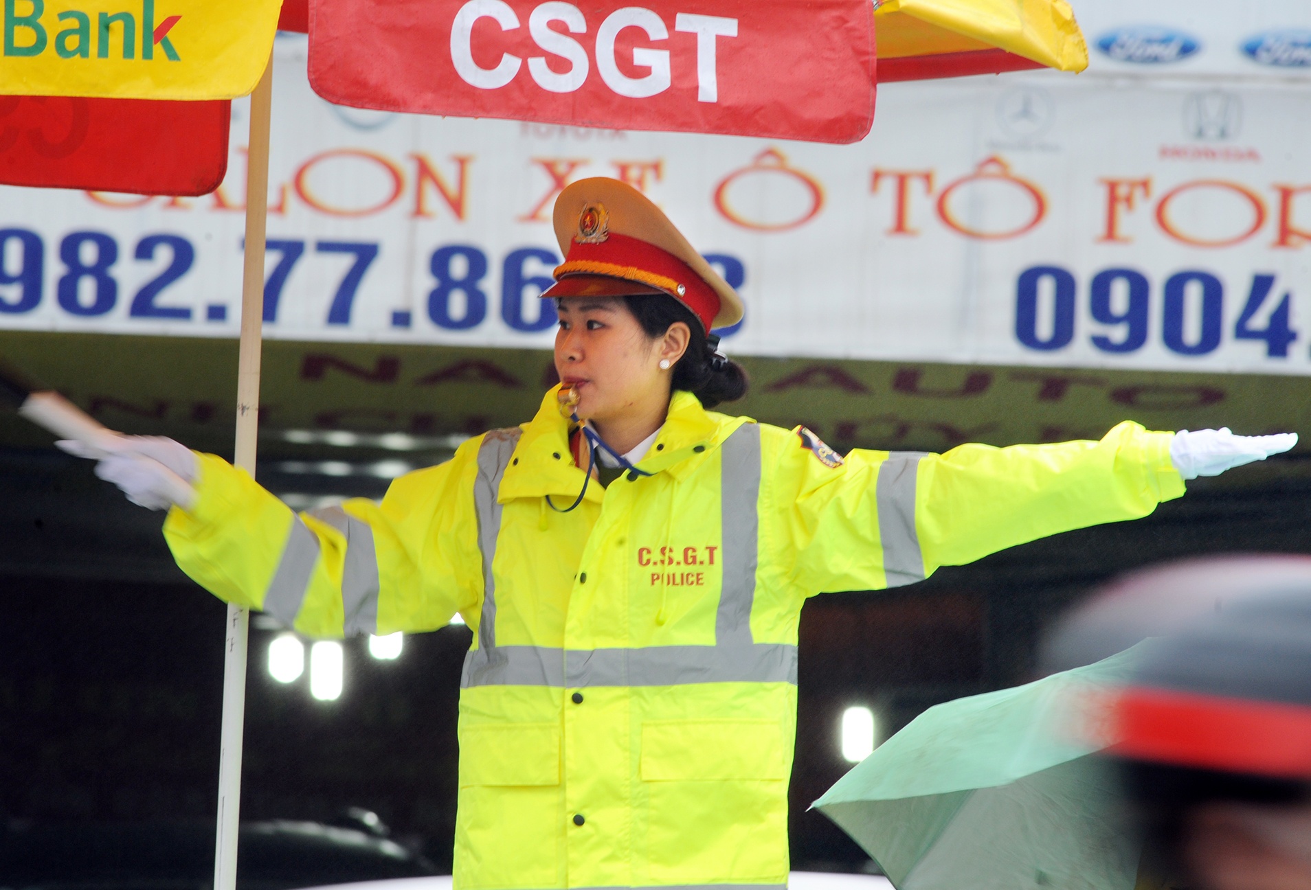 Nữ cảnh sát giao thông xuống phố ngày mưa