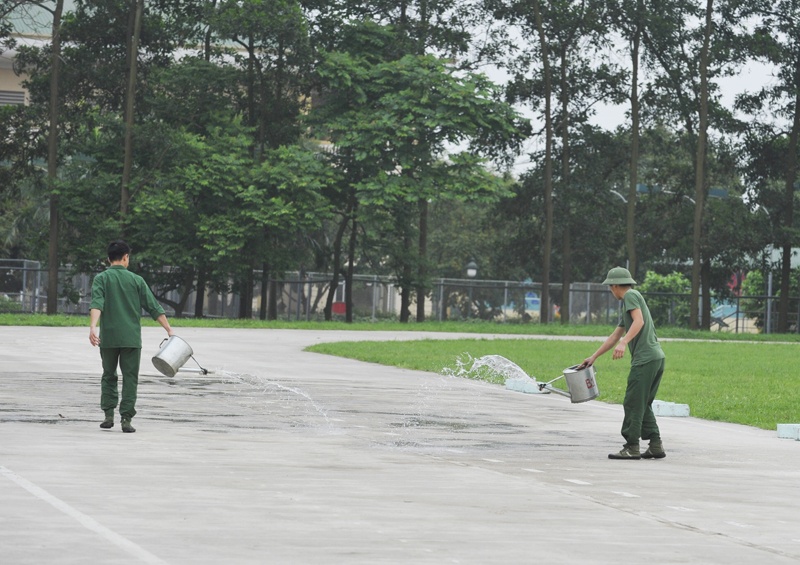 Nhiều hôm nắng quá các chiến sĩ phải tưới nước làm mát đường và giảm bụi.
