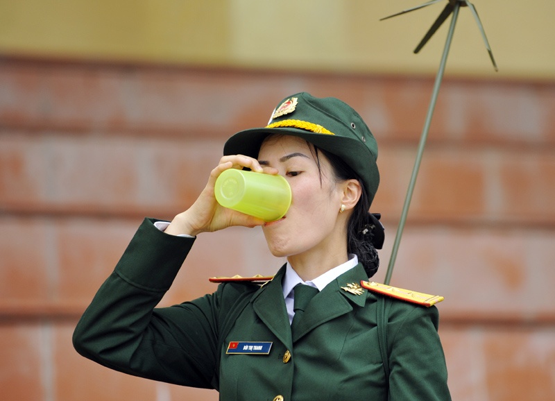 Trung úy Bùi Thị Thanh trong giờ giải lao. Chị cho biết, chỉ khát nước mà không thấy mệt lắm dù rất vất vả.