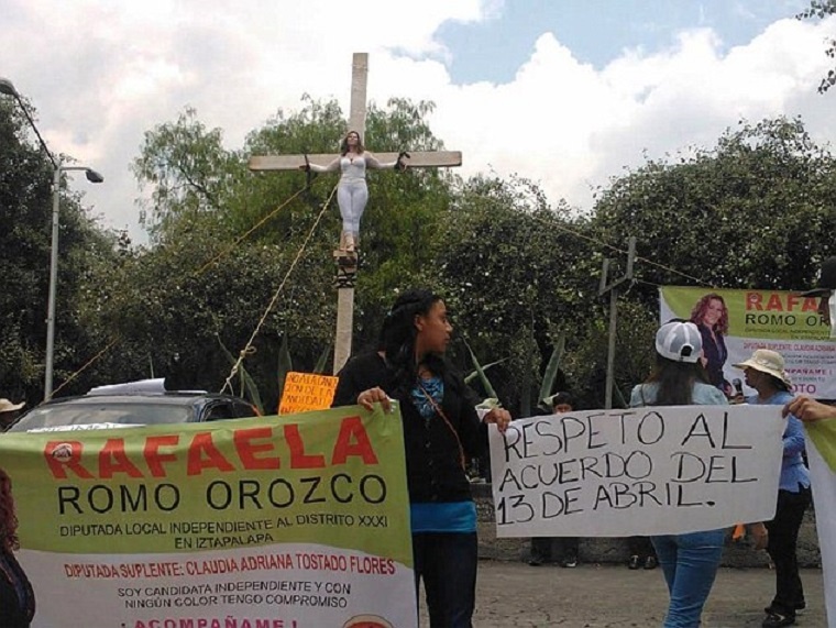 Hôm 7/5, nữ chính trị gia quyết định tự treo trên cây thánh giá có chiều cao hơn 6 m trước Ủy ban Bầu cử Quốc gia ở Mexico City để phản đối. Romo không đeo giày mà chỉ mặc quần bó màu trắng và áo màu kem rồi nhờ người khác trói bà vào thánh giá trong hai tiếng.