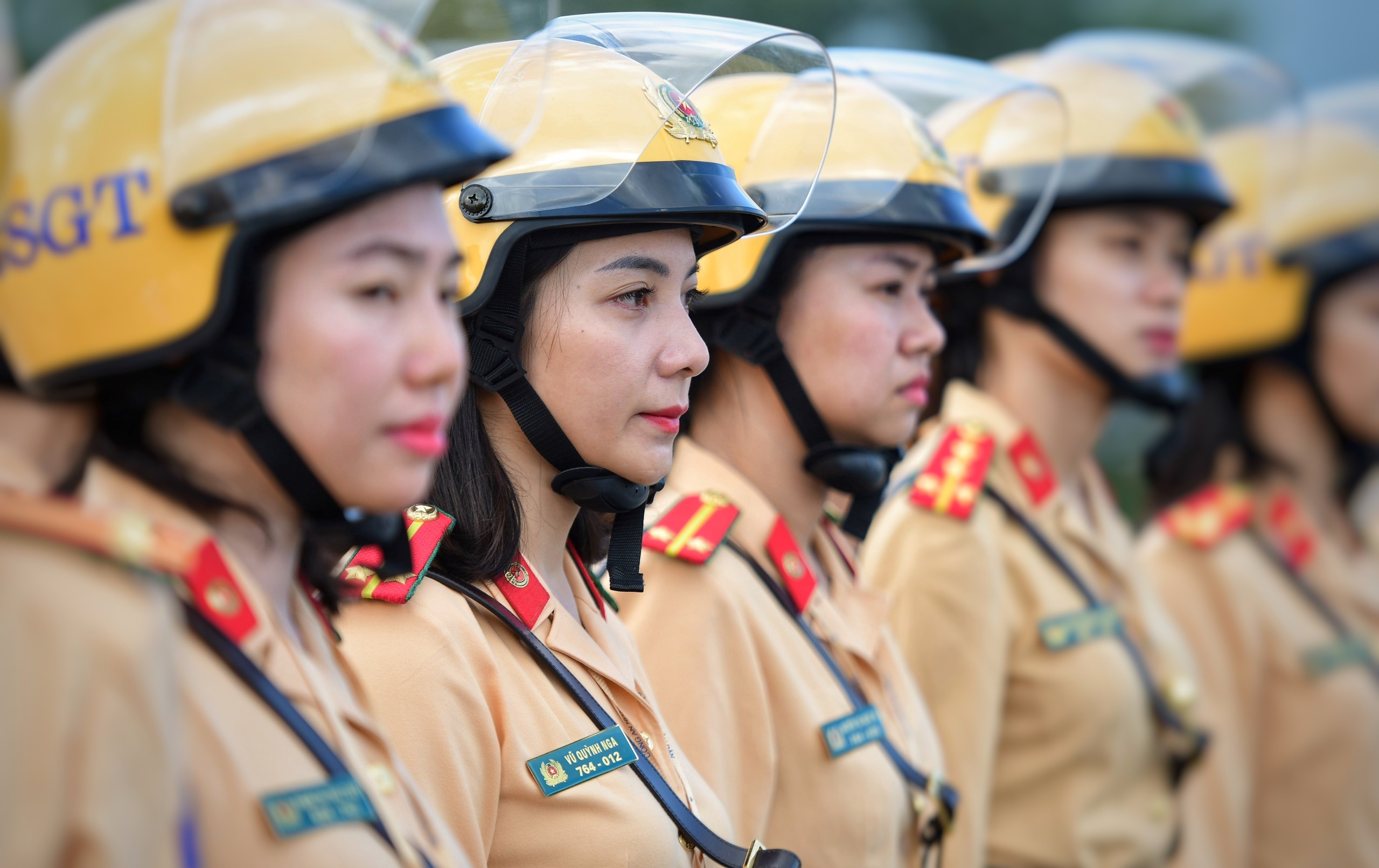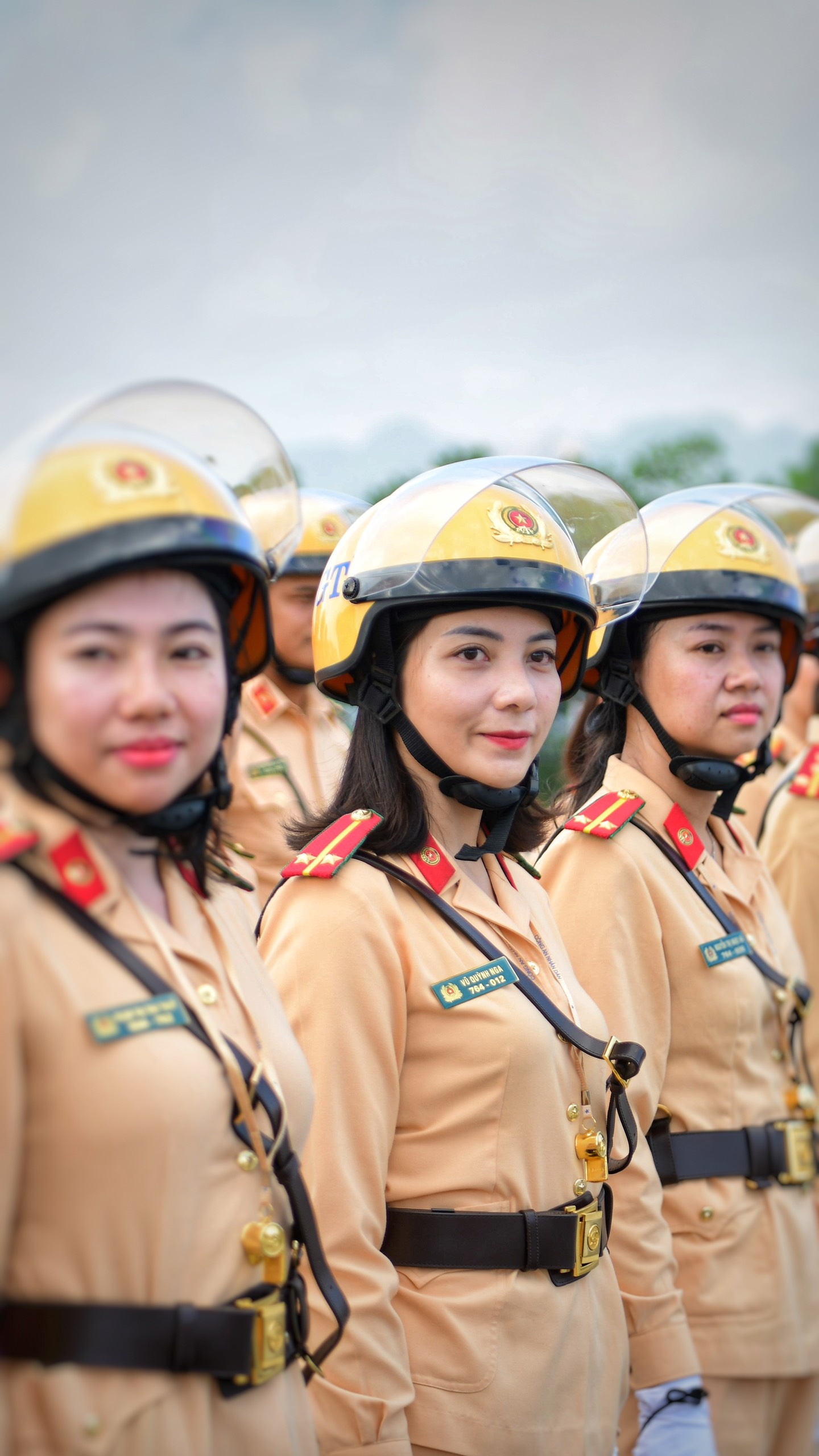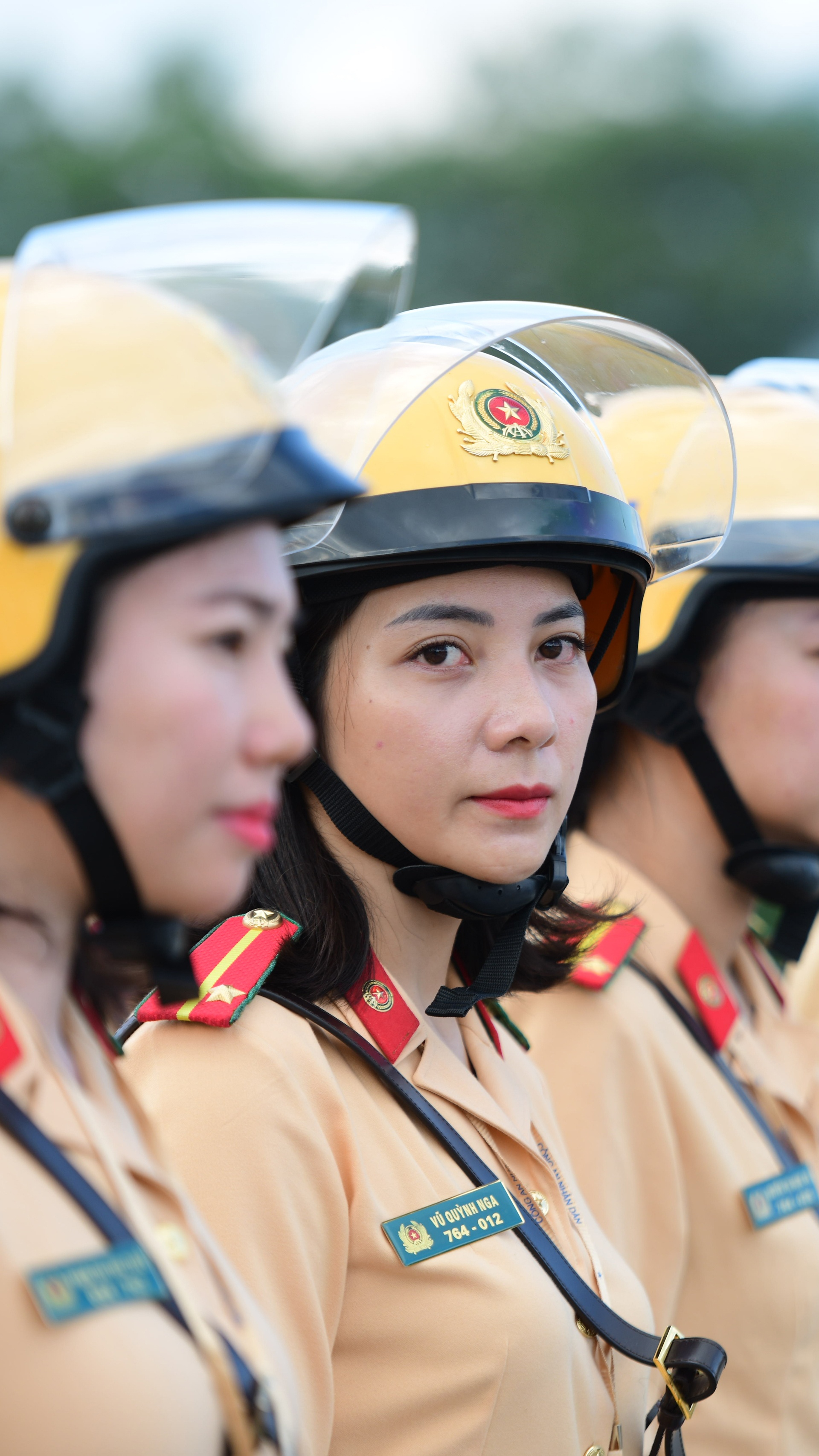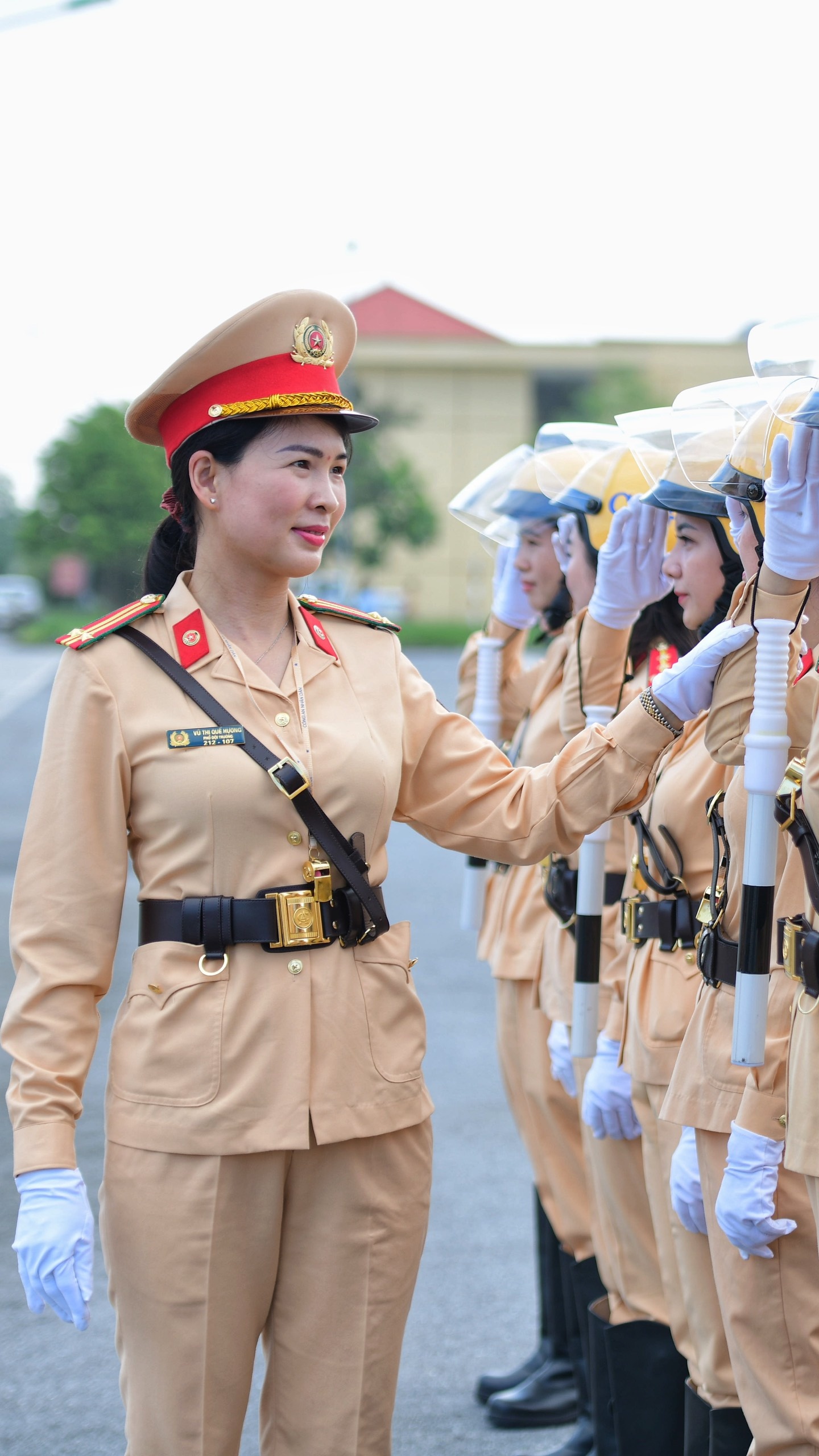 Những ngày diễn ra Đại hội Đảng XIII, chúng tôi thức giấc lúc 3h30. Được coi là những người đại diện cho lực lượng, nữ CSGT dẫn đoàn phải dậy sớm để chuẩn bị quân phục, điều lệnh, đảm bảo khuôn trang rạng rỡ nhất. Khi dẫn đoàn chính thức, cầu vai của tất cả 20 chị, em đều được trang bị hàm đại úy để đảm bảo đồng bộ.