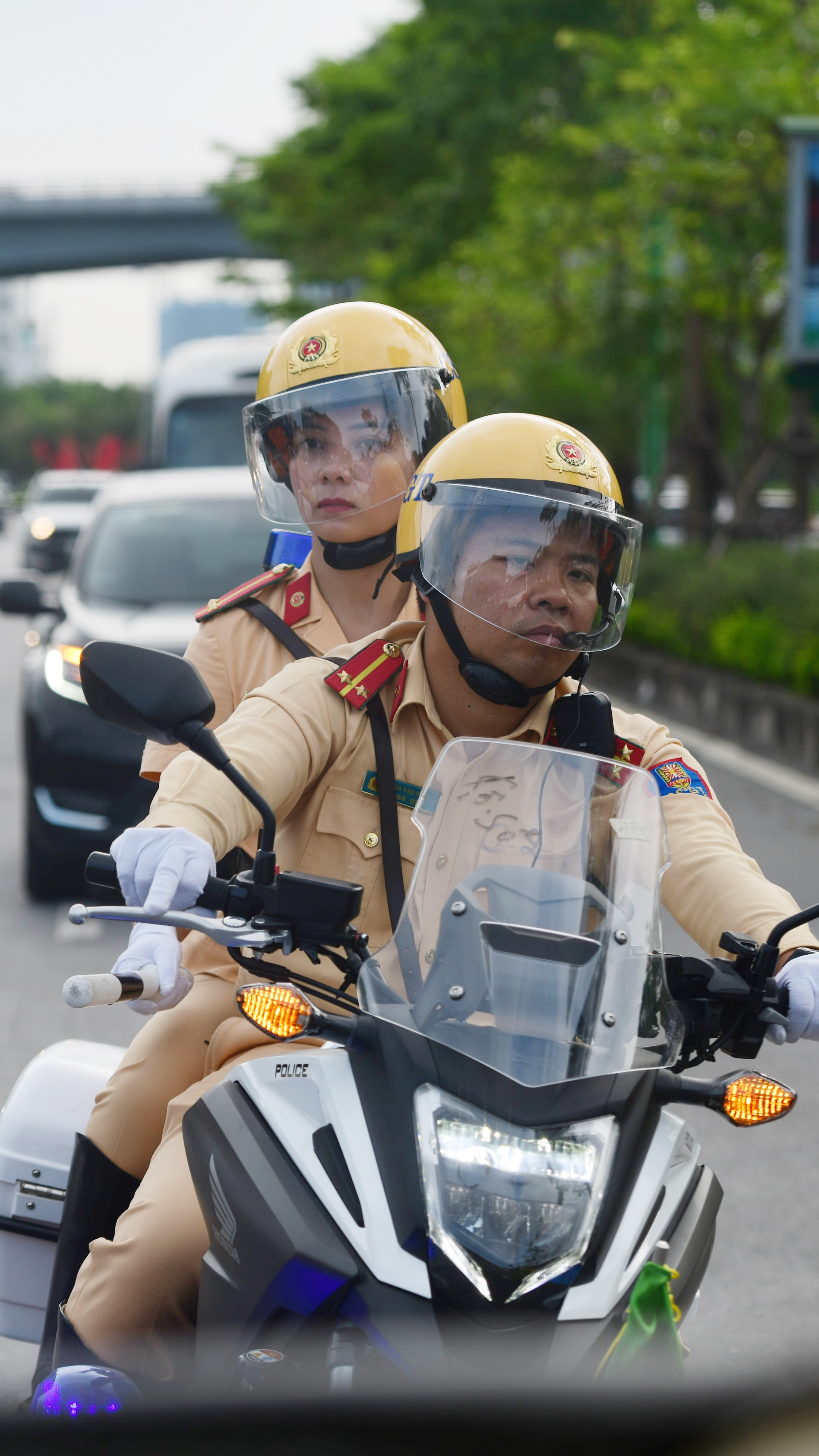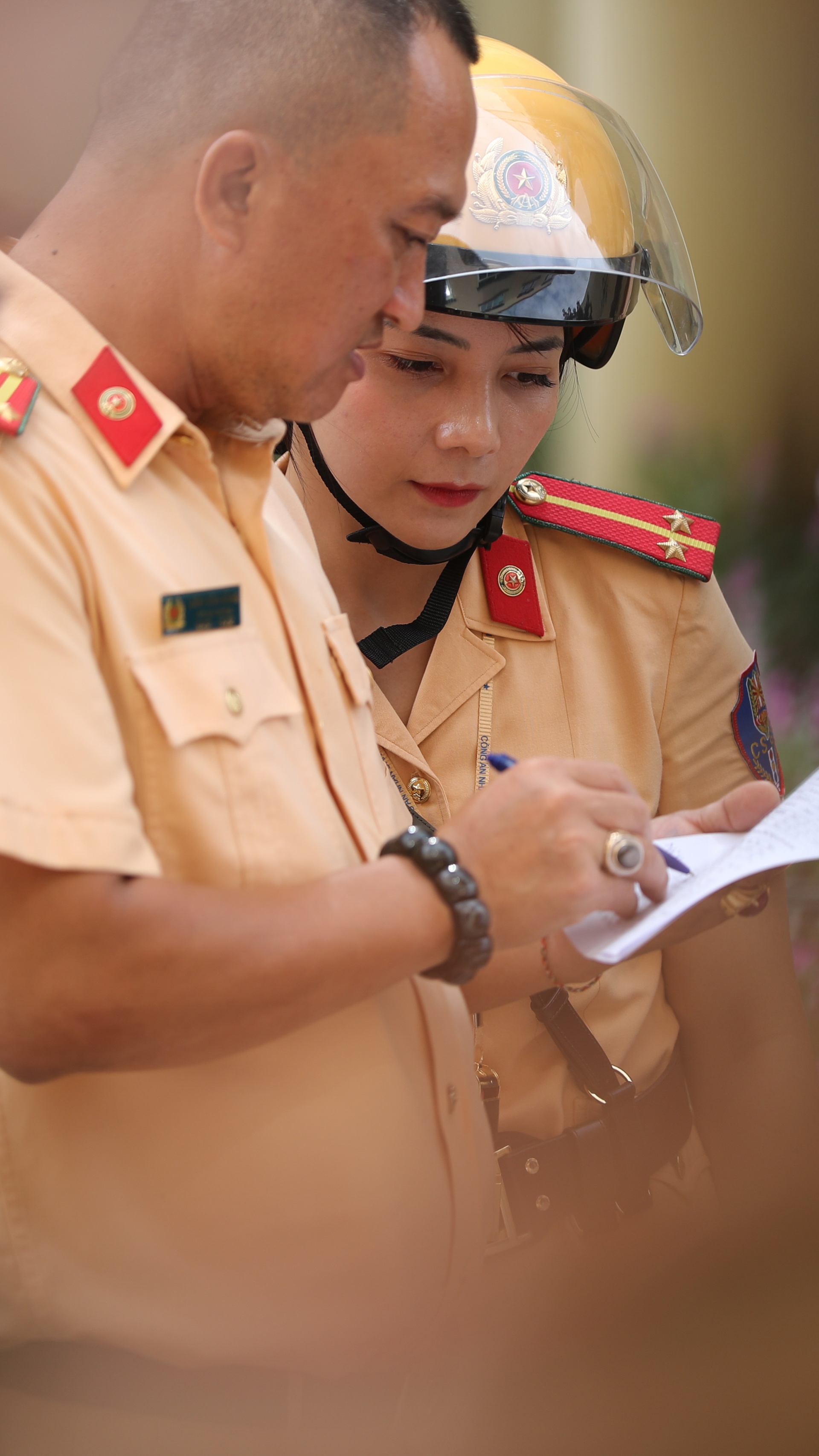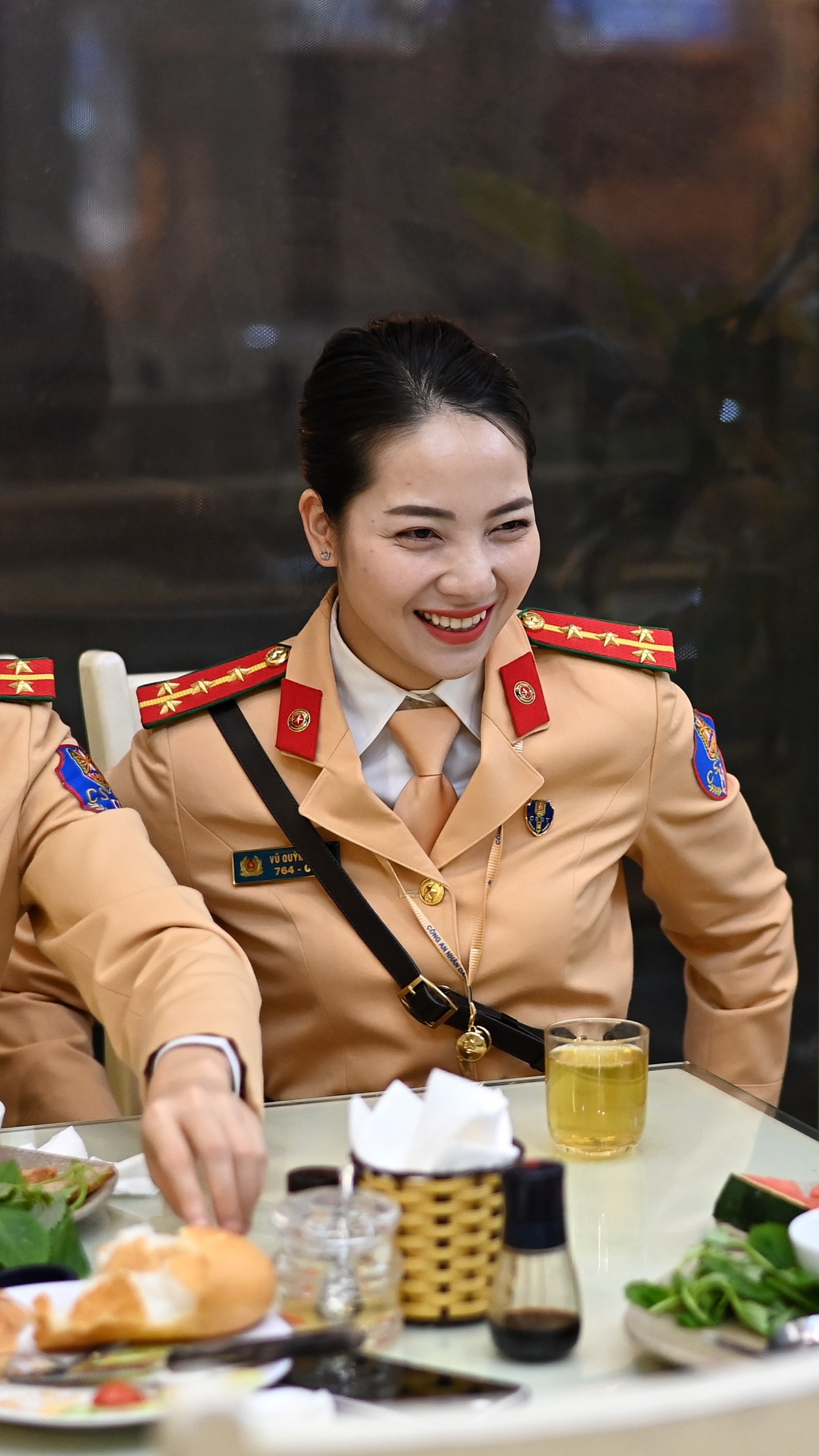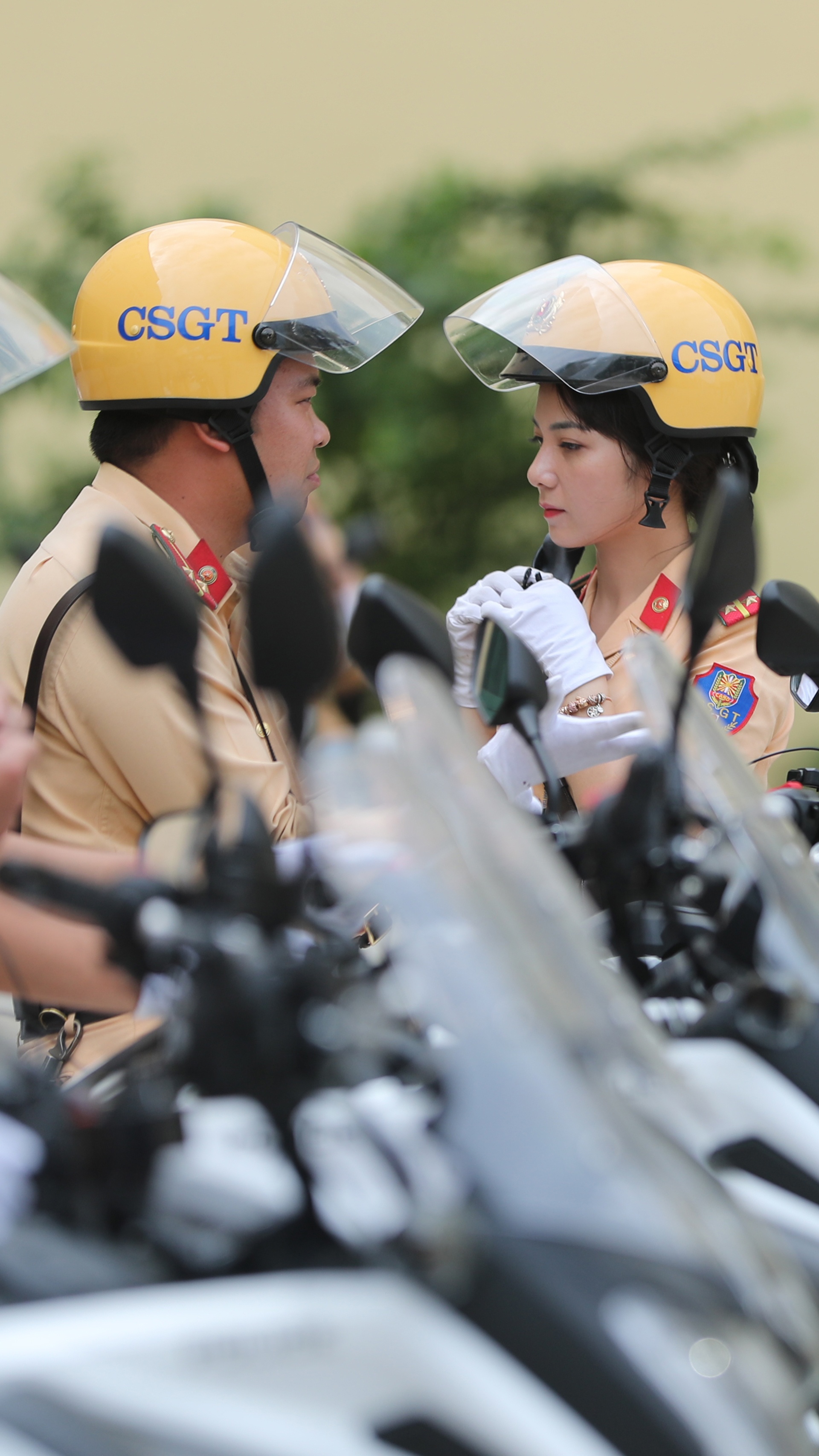 Những ngày diễn ra Đại hội Đảng XIII, chúng tôi thức giấc lúc 3h30. Được coi là những người đại diện cho lực lượng, nữ CSGT dẫn đoàn phải dậy sớm để chuẩn bị quân phục, điều lệnh, đảm bảo khuôn trang rạng rỡ nhất. Khi dẫn đoàn chính thức, cầu vai của tất cả 20 chị, em đều được trang bị hàm đại úy để đảm bảo đồng bộ.