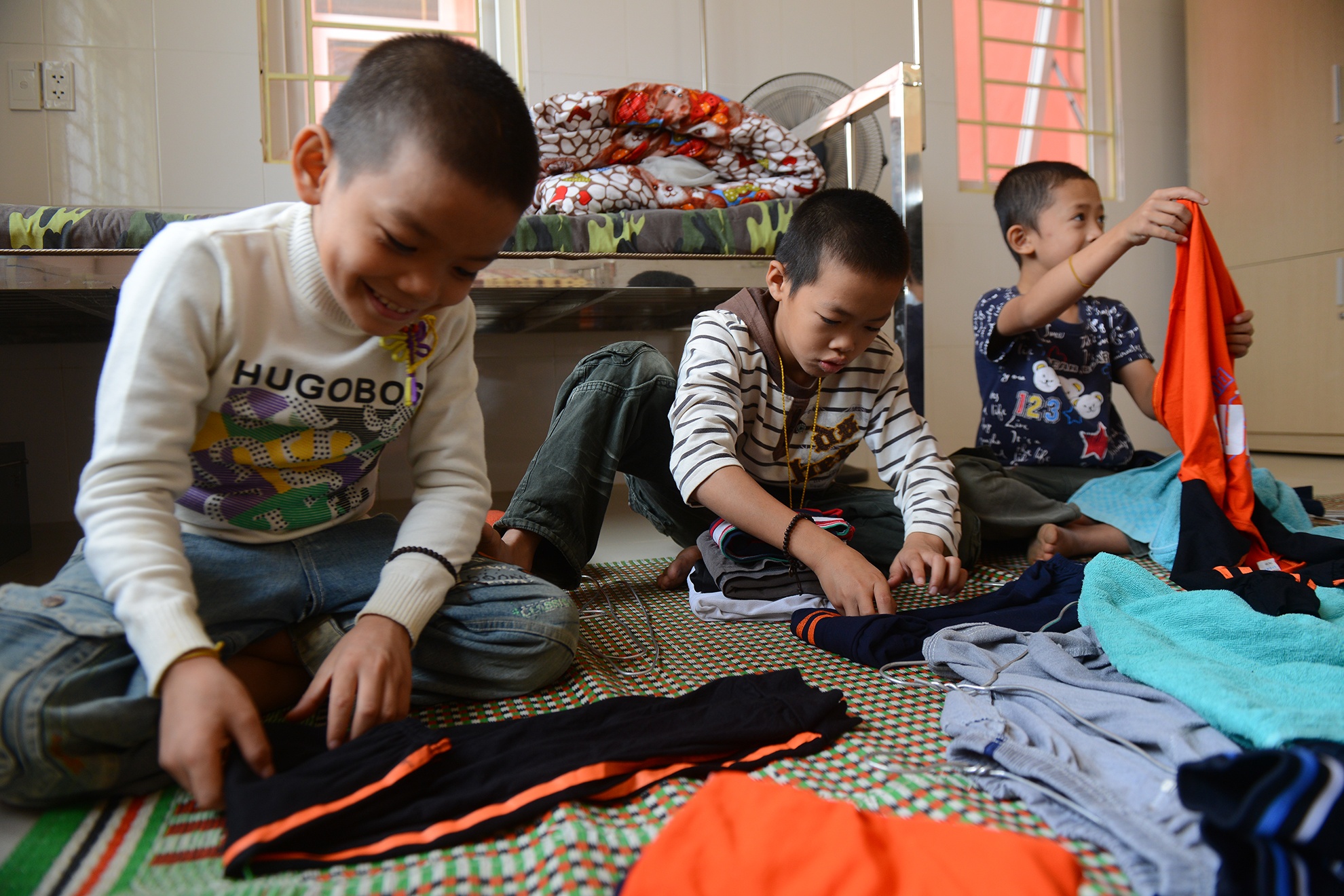 | Xong việc gấp quần áo, các bé được chơi tự do trong lúc chờ tới giờ cơm trưa. Đây là phòng ngủ với giường tầng, tủ quần áo và kệ sách. Mỗi giường có 2 tầng, mỗi tầng có hai bé ngủ chung. Tủ quần áo được ghi tên từng người và các bé tự giác chăm lo cho góc cá nhân. |