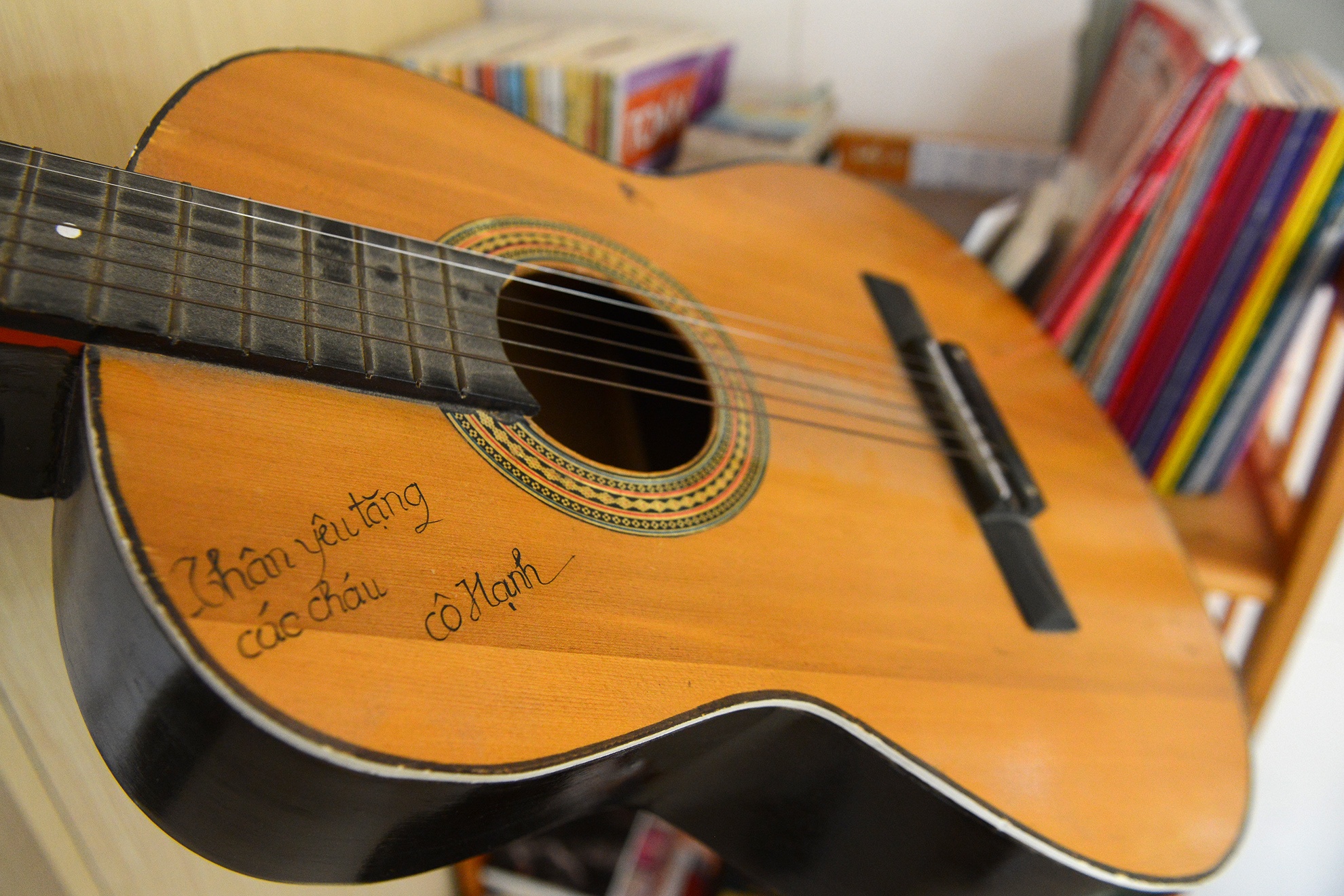 | Giá sách của các anh lớn được sắp xếp khá gọn gàng. Dù đi học trường cấp 3 cách nhà hơn 20 km song anh cả trong nhà Dế mèn lựa chọn đi về bằng xe buýt thay vì ở thuê gần trường như các bạn khác. Cậu bé 17 tuổi khoe chiếc đàn ghi-ta, món quà đặc biệt của một người cô dành tặng. Dù không được học bài bản, phải tự mày mò từng nốt nhạc, chàng trai trẻ đã gắn bó và sẻ chia với người bạn tinh thần này những vui buồn trong nhiều năm qua.