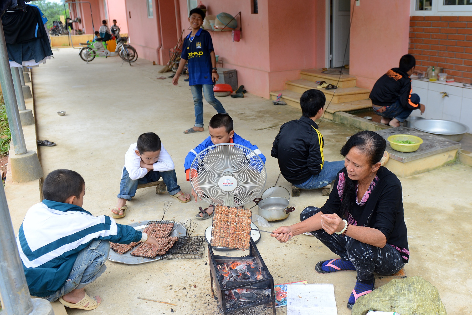 Cùng lúc, các em ở lứa tuổi khác phụ mẹ nuôi chuẩn bị bữa trưa. Vì là sáng ngày nghỉ, các mẹ nuôi nấu những món đặc biệt như bún chả, bún thịt khiến đám trẻ rất thích thú. Nơi đây có 8 ngôi nhà, trong đó có 4 nhà chính - Dế mèn, Bồ Câu, Sóc nhí, Ban mai - là nơi sinh hoạt của các em từ 2-18 tuổi. Mỗi nhà có một mẹ nuôi, ba cán bộ và trên dưới 20 đứa trẻ ở nhiều độ tuổi khác nhau.