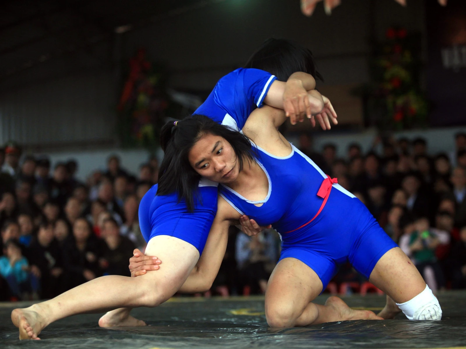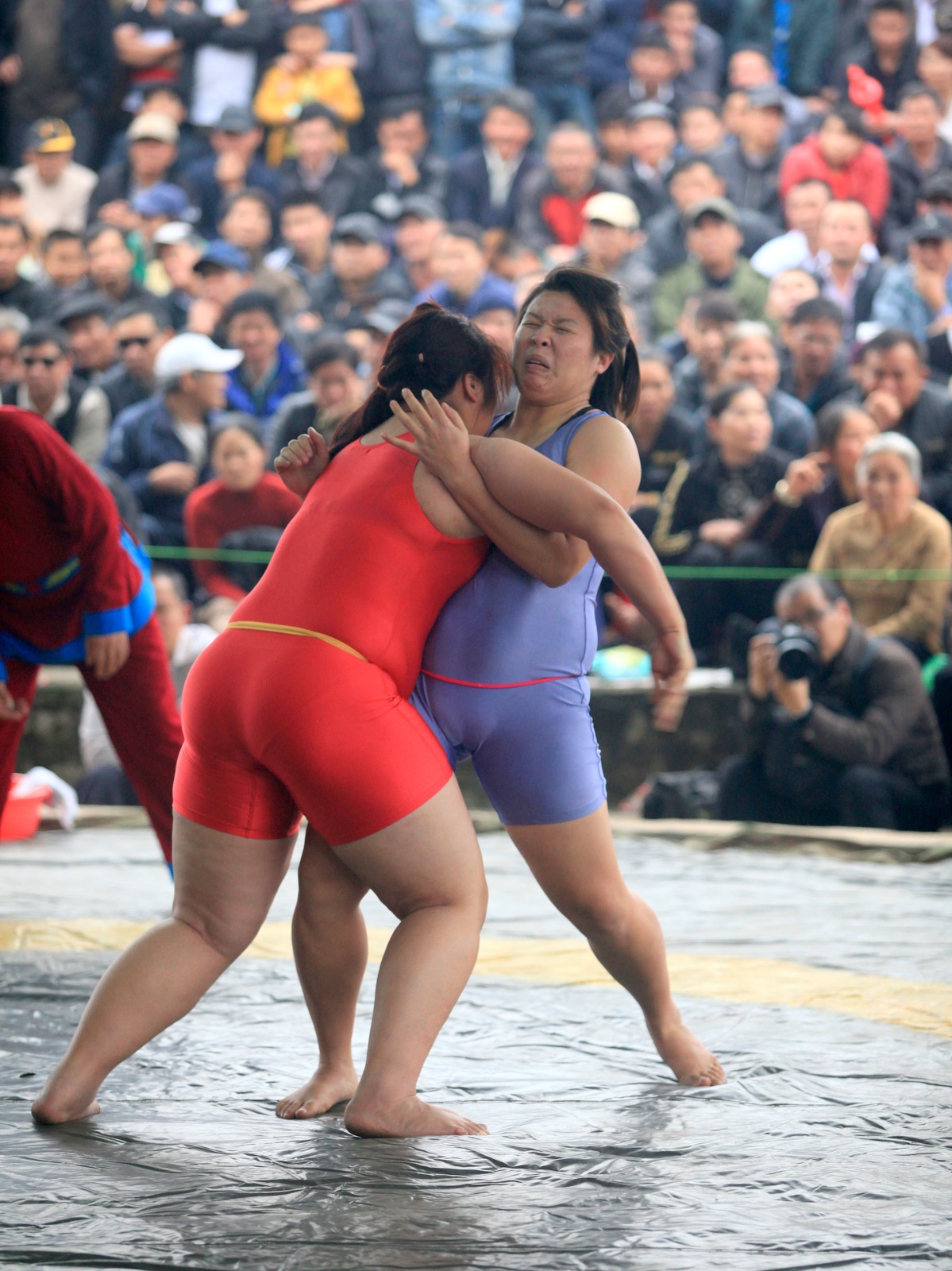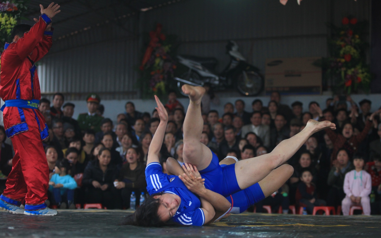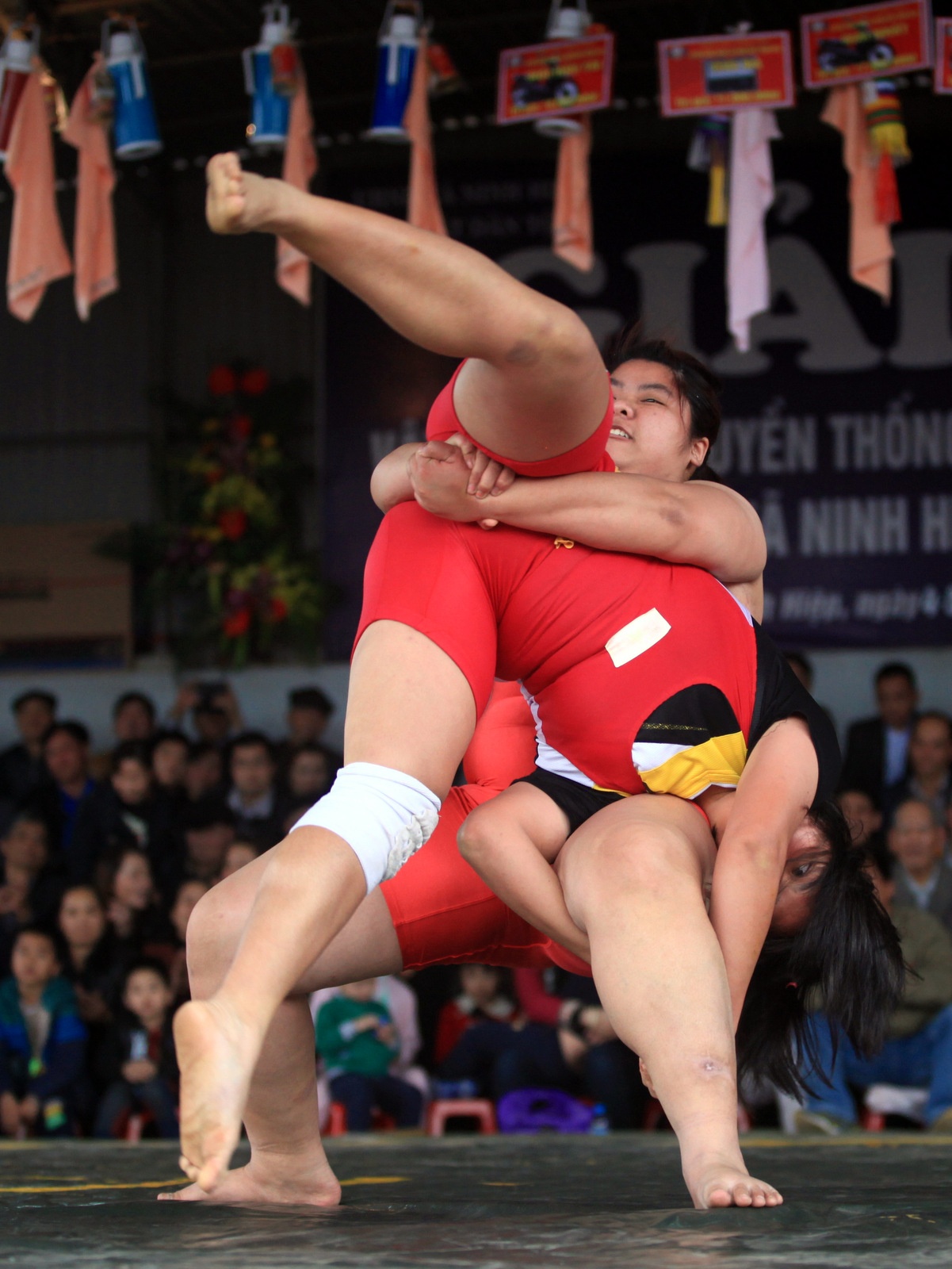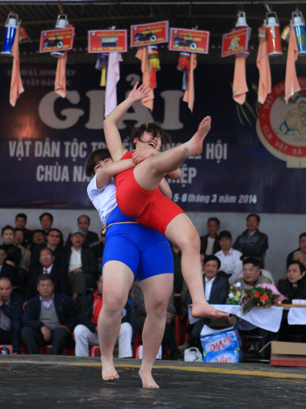 Giải vật dân tộc truyền thống lễ hội chùa Nành xã Ninh Hiệp, Gia Lâm, Hà Nội diễn ra từ 4 - 6/2 âm lịch hàng năm. Chiều 5/3, ngày hội đã mang lại nhiều tiếng cười sảng khoái cho người xem khi xuất hiện những trận đấu nữ không phân biệt hạng cân. Bên phải ảnh là Hà Thị Nga, vận động viên vật của quân đội và cũng là người có trọng lượng lớn nhất giải.