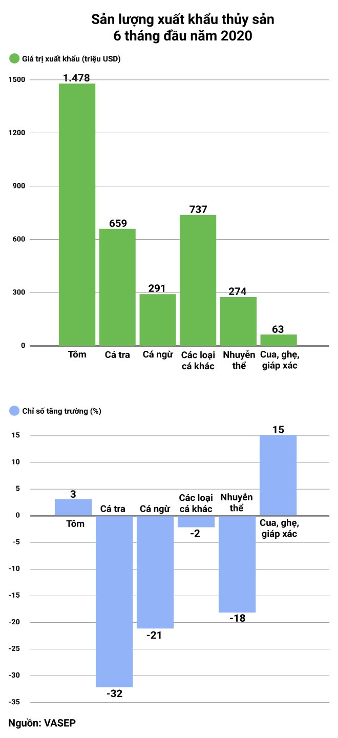 Trong khi ngành cá tra gặp thách thức lớn, mặt hàng thủy sản chủ lực còn lại của Việt Nam là tôm gặt hái kết quả khả quan hơn. Thống kê của VASEP cho biết tôm là mặt hàng duy nhất tăng trưởng dương (+3%) khi tổng kim ngạch xuất khẩu thủy sản giảm 11% trong nửa đầu 2020.