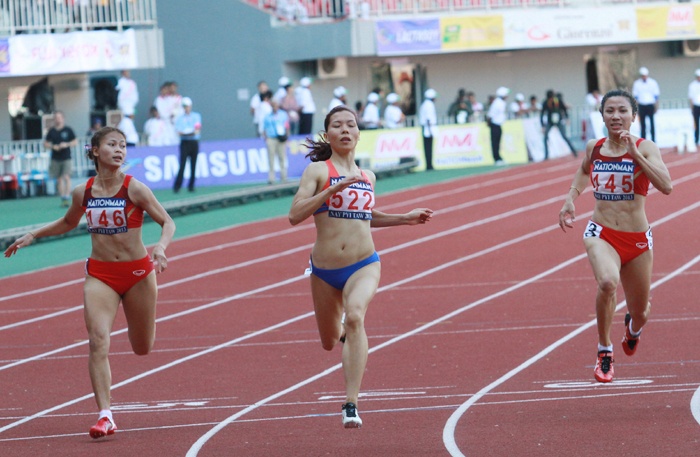 | Vũ Thị Hương về nhất ở cự ly 100m tại SVĐ Wunna Theikdi, Myanmar. |