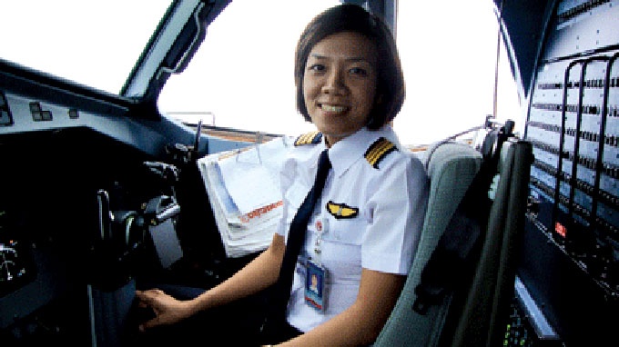 “Mình vừa được chuyển từ tàu bé sang tàu to đấy!” (chuyển từ lái máy bay ATR 72 sang lái máy bay Airbus 321) - Nguyễn Thị Thanh Thủy, nữ phi công của Hãng hàng không quốc gia Việt Nam (VNA) vui vẻ thông báo. Cô hay gọi máy bay là tàu - cách gọi nghe dân dã, gần gũi. Thủy sinh năm 1982, là một trong hai nữ phi công đầu tiên người Việt Nam được đào tạo chính quy, bài bản. Sau thời gian làm lái phụ điều khiển máy bay ATR 72, Thủy mới chuyển sang làm lái phụ đội bay Airbus 321. Mái tóc cắt ngắn, đôi mắt to đẹp, tác phong dứt khoát, nhanh nhẹn, ở Thủy toát lên vẻ đẹp mạnh mẽ và thu hút.
