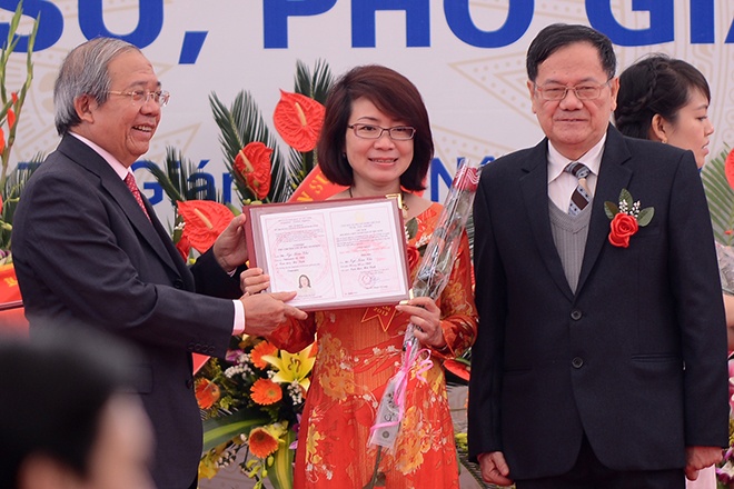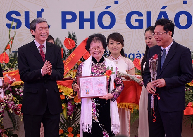 Bên cạnh giáo sư 72 tuổi thạo 4 thứ tiếng, phó giáo sư trẻ nhất vừa tròn 30 tuổi, nữ phó giáo sư xinh đẹp dòng họ Nguyễn Lân cũng rạng rỡ trong ngày trao giấy chứng nhận đạt chuẩn chức danh năm 2013.
