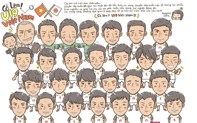 | Bức tranh mà nữ phóng viên Nhật Bản vẽ tặng cả đoàn U19 Việt Nam trước khi thầy trò HLV Graechen rời đất nước mặt trời mọc sau chuyến tập huấn. |