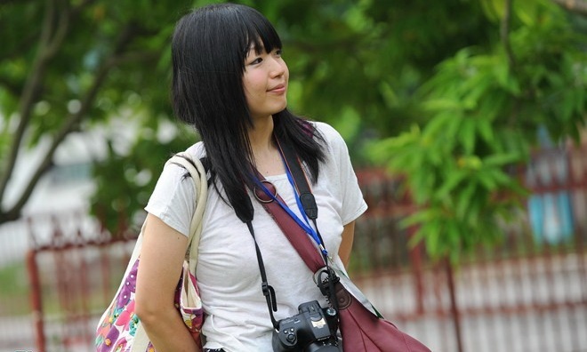 | Nữ phóng viên đến từ xứ sở mặt trời mọc có mặt trong buổi tập của U19 Việt Nam chuẩn bị cho trận đối đầu với U19 Nhật Bản trong khuôn khổ vòng bảng giải U19 Đông Nam Á 2014 - Cup NutiFood. Cô cũng chính là phóng viên duy nhất đồng hành cùng với U19 Việt Nam trong suốt quãng thời gian 1 tháng tập huấn tại Nhật Bản. Ảnh: Tùng Lê. |