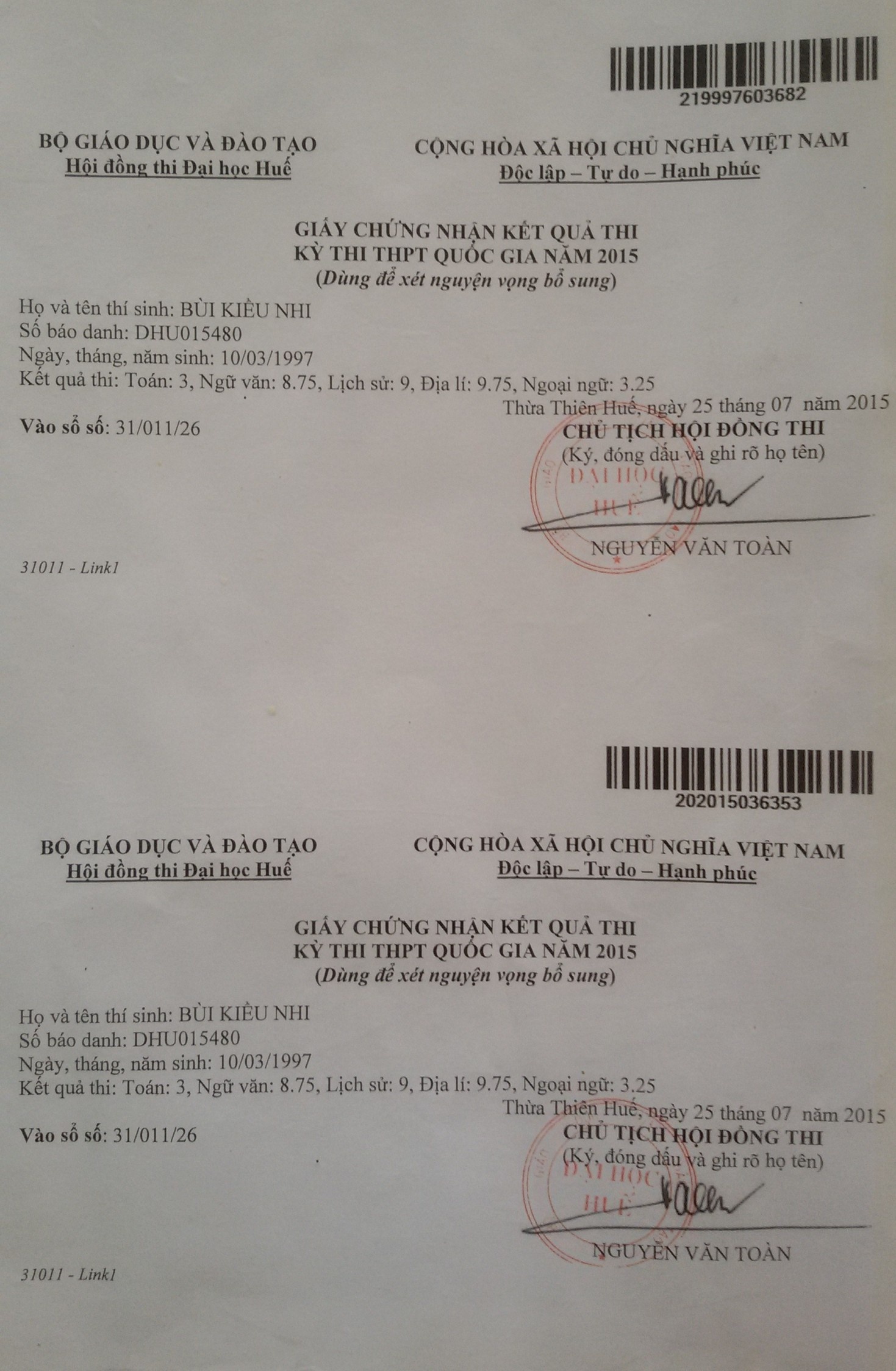 | Phiếu báo điểm thi của Nhi tại Hội đồng thi Đại học Huế. Ảnh: Văn Được. |