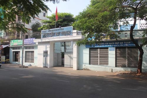 | Cổng trường THPT Nguyễn An Ninh, nơi xảy ra sự việc 3 nữ sinh bị “cướp tóc”. |