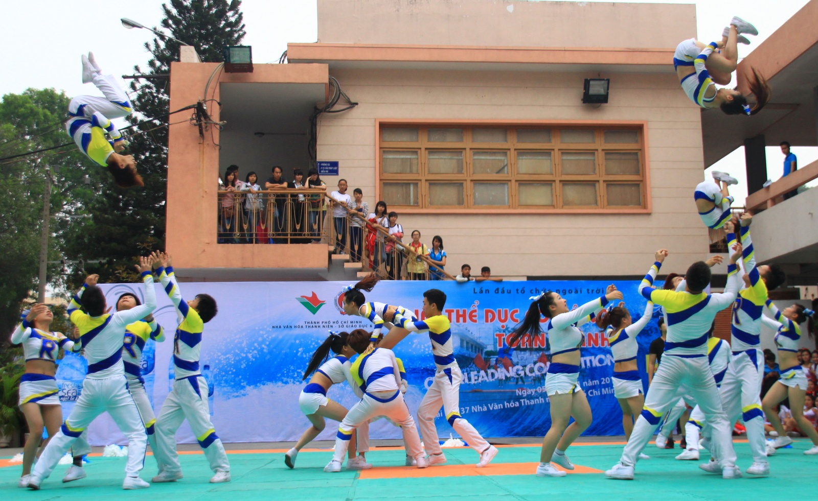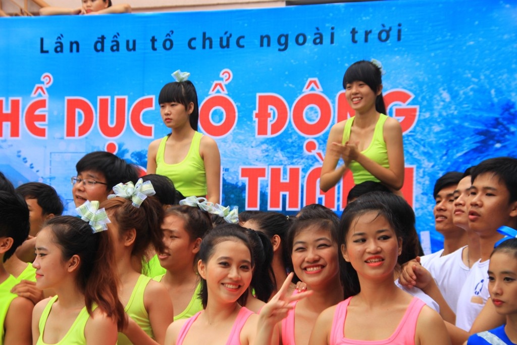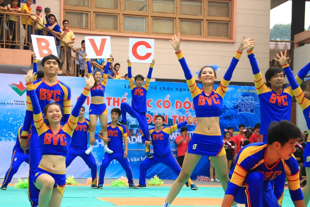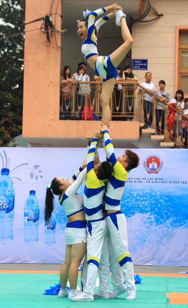 Nữ sinh trường ĐH KHXH & NV Hà Nội đã trình diễn những màn nhào lộn ấn tượng trong cuộc thi thể dụng cổ động TP.HCM.