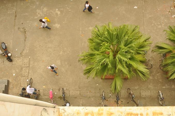 | Hiện trường nhìn từ tầng 4 là nơi nữ sinh bất ngờ rơi xuống. |